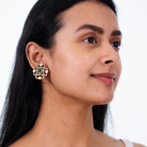 Beautifully handcrafted in 925 sterling silver, these regal stud earrings feature a rich emerald-green color stone at the center, surrounded by shimmering moissanite and cubic zirconia (CZ). Finished with delicate pearl drops and a luxurious gold polish, they bring timeless royal charm to festive, wedding, and traditional ensembles. A perfect blend of heritage design and…