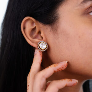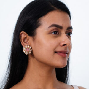 Inspired by the serene beauty of the “pankaj” (lotus), these stud earrings feature a soft pink rose quartz at the center, surrounded by petal-like arrangements of sparkling white stones.