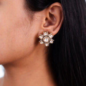 These eye-catching stud earrings feature a beautifully detailed, bloom-like arrangement of numerous polki diamonds, creating a rich and textured sparkle.