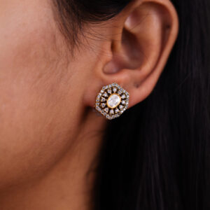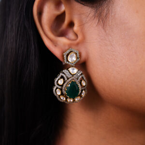 Make a statement with these regal emerald polki earrings. A striking oval-cut emerald sits at the heart of each earring, surrounded by a meticulous arrangement of mozonites, set in intricate gold craftsmanship. The hexagonal mozonites along with swarovskis adds a unique architectural touch, making these earrings a perfect blend of tradition and modern elegance.
