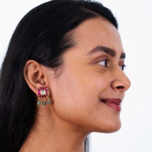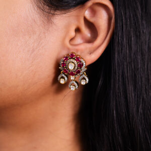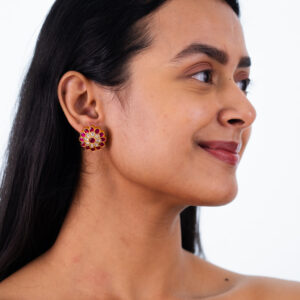 These stud earrings highlight a radiant center surrounded by vibrant ruby petals, each meticulously set in Kundan work, creating a focal point of beauty for your ensemble.