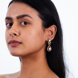 A masterpiece of elegance, these polki diamond drop earrings radiate understated luxury. Featuring uncut diamonds in a delicate floral setting, they cascade into a bold teardrop-shaped polki, encircled by fine-cut swaroskis for added brilliance. Set in gold, these earrings blend traditional charm with modern sophistication, making them perfect for bridal ensembles, festive occasions, or timeless…