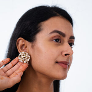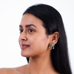 Inspired by classic Indian motifs, these stud earrings showcase a beautiful cluster design with vibrant green emeralds and luminous pearls, enhanced by delicate sparkling details. A timeless and culturally rich piece for events.
