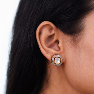 Refined stud earrings featuring a luminous cushion-cut mozonite, its natural brilliance enhanced by a delicate outline of sparkling Swarovski crystals.