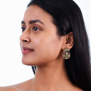 Evoking a sense of heritage, these drop earrings showcase two distinct emerald designs, one square and one round with mozonite and swarovski accents, connected in an ornate fashion. A timeless and culturally rich piece.