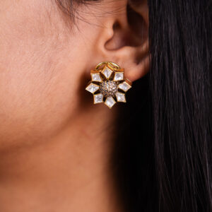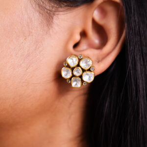 ₹7,300.00These earrings evoke the soft shimmer of a distant constellation, with uniquely shaped white gemstones clustered together and punctuated by tiny, brilliant accents.