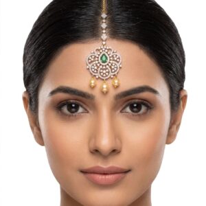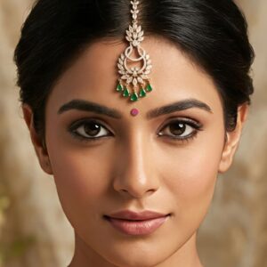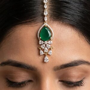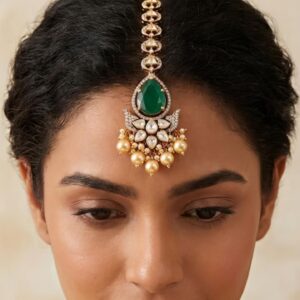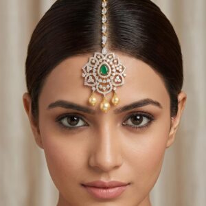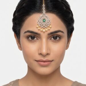 Graceful silver maang tikka adorned with sparkling moissanite and CZ stones, finished with elegant green colorstone drops. A perfect statement piece for weddings and festive occasions, adding a touch of traditional charm and brilliance to your look.
