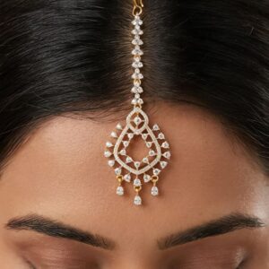 Exude timeless elegance with this beautifully crafted silver maang tikka, designed to complement both traditional and contemporary looks. Adorned with brilliant moissanite and high-quality cubic zirconia (CZ) stones, this piece sparkles with a luxurious diamond-like finish.