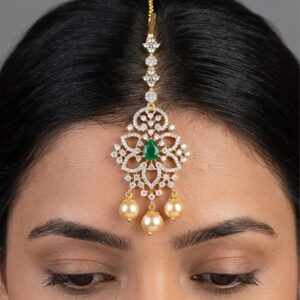 Handcrafted silver Maang Tikka with an exquisite Emerald-cut colorstone centerpiece and three golden pearl droplets. Intricately studded with brilliant Cubic Zirconia (CZ) for a traditional, high-end look. Perfect for weddings and grand festive occasions.