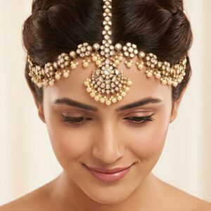 Elevate your ethnic look with this exquisitely crafted silver maang tikka, designed to radiate timeless elegance. Adorned with dazzling moissanite and cubic zirconia (CZ) stones, this piece beautifully mimics the brilliance of fine diamonds.At the center lies a rich green colourstone that adds a striking pop of color, perfectly complemented by intricate detailing and delicate…