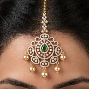 Beautifully crafted silver maang tikka featuring sparkling moissanite and CZ stones, accented with a rich green centerpiece and elegant pearl drops. Designed to add a regal touch, this piece is perfect for bridal and festive wear.