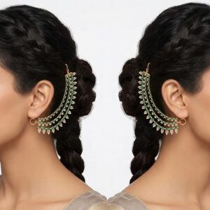 Elevate your bridal or festive ensemble with this exquisite Triple-Strand Ear-Chain (Sahare). Expertly handcrafted in 925 Sterling Silver, this piece features three cascading tiers of brilliant Moissanite and high-grade CZ stones, meticulously set to capture the light from every angle.The design is accented with rich, oval-cut Emerald-green color stones, arranged in a delicate floral-leaf motif…