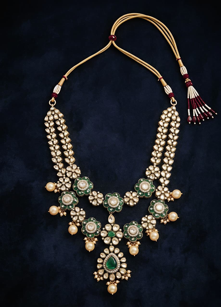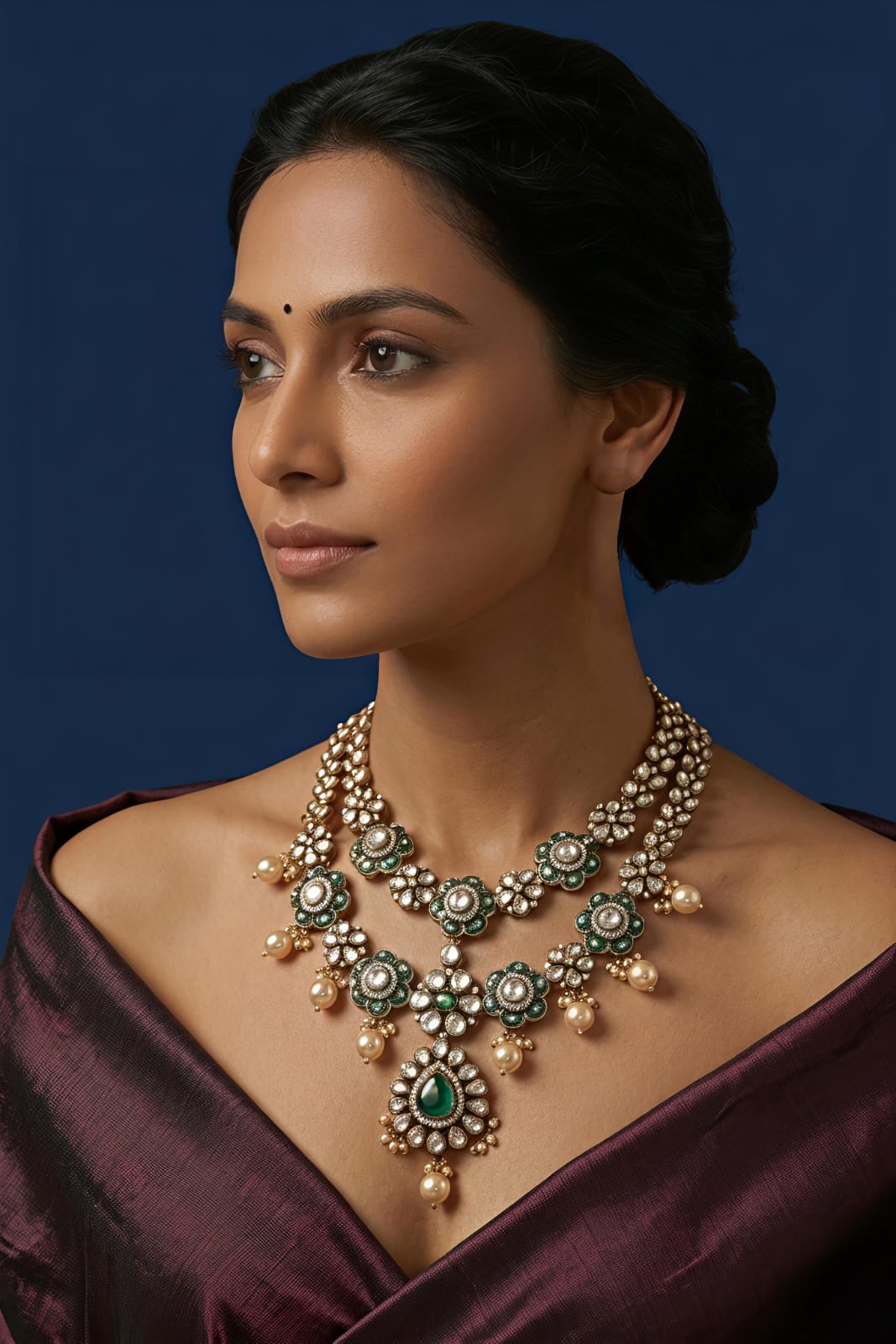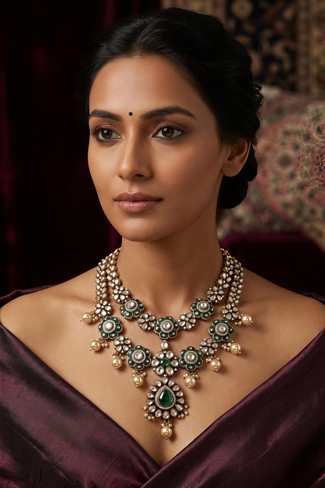 Elegant 92.5 sterling silver necklace adorned with sparkling moissanite, premium CZ, and rich emerald green colourstones. Designed with intricate floral motifs and finished with pearl drops, this statement piece is perfect for weddings and festive occasions.