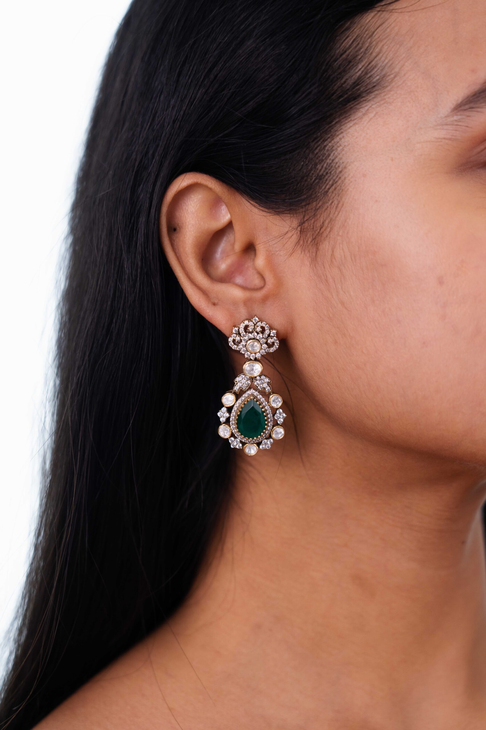 Exquisite 19th-century inspired drop earrings featuring vibrant pear-shaped emeralds surrounded by dazzling mine-cut diamonds in an intricate antique setting. A timeless statement of elegance and heritage.