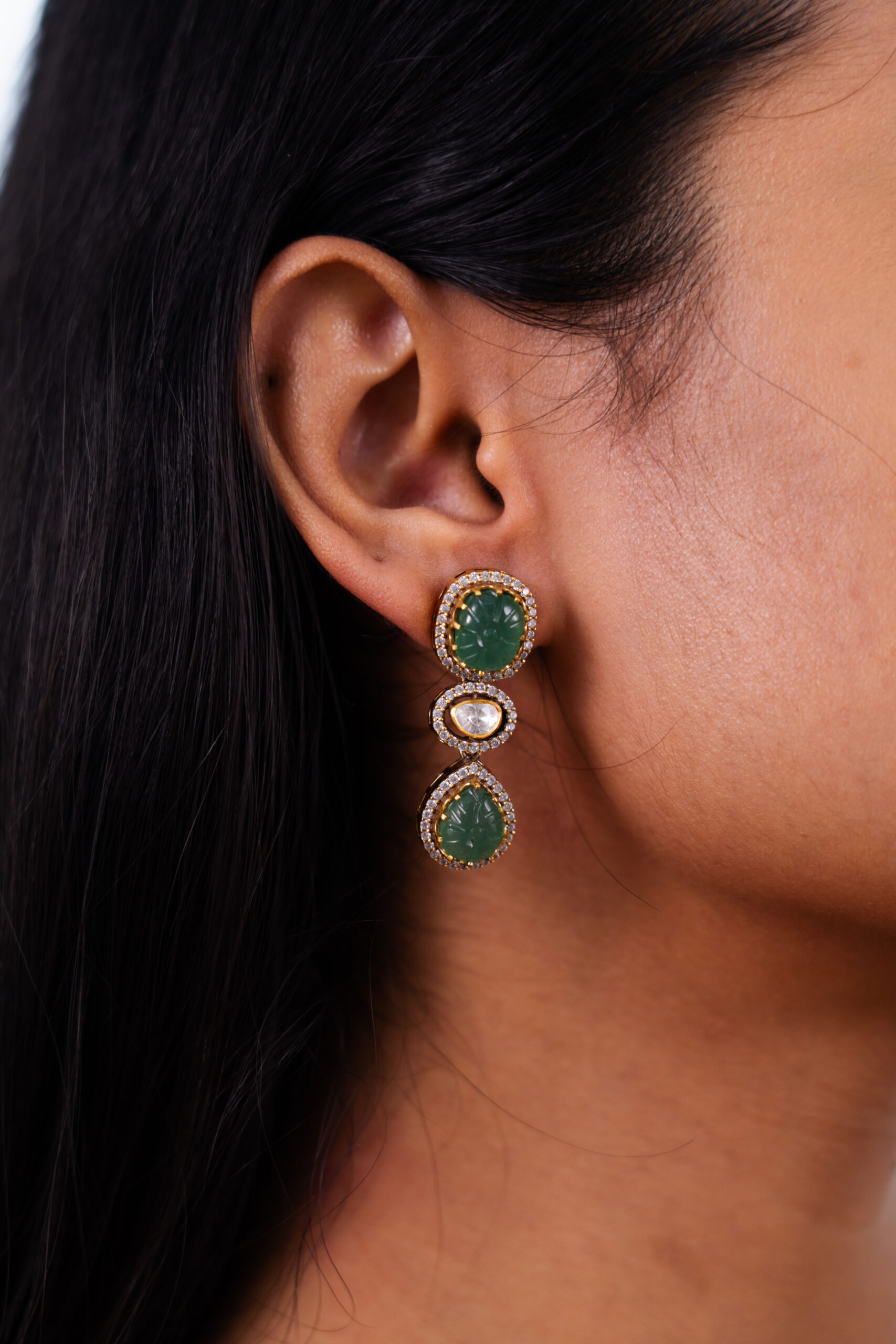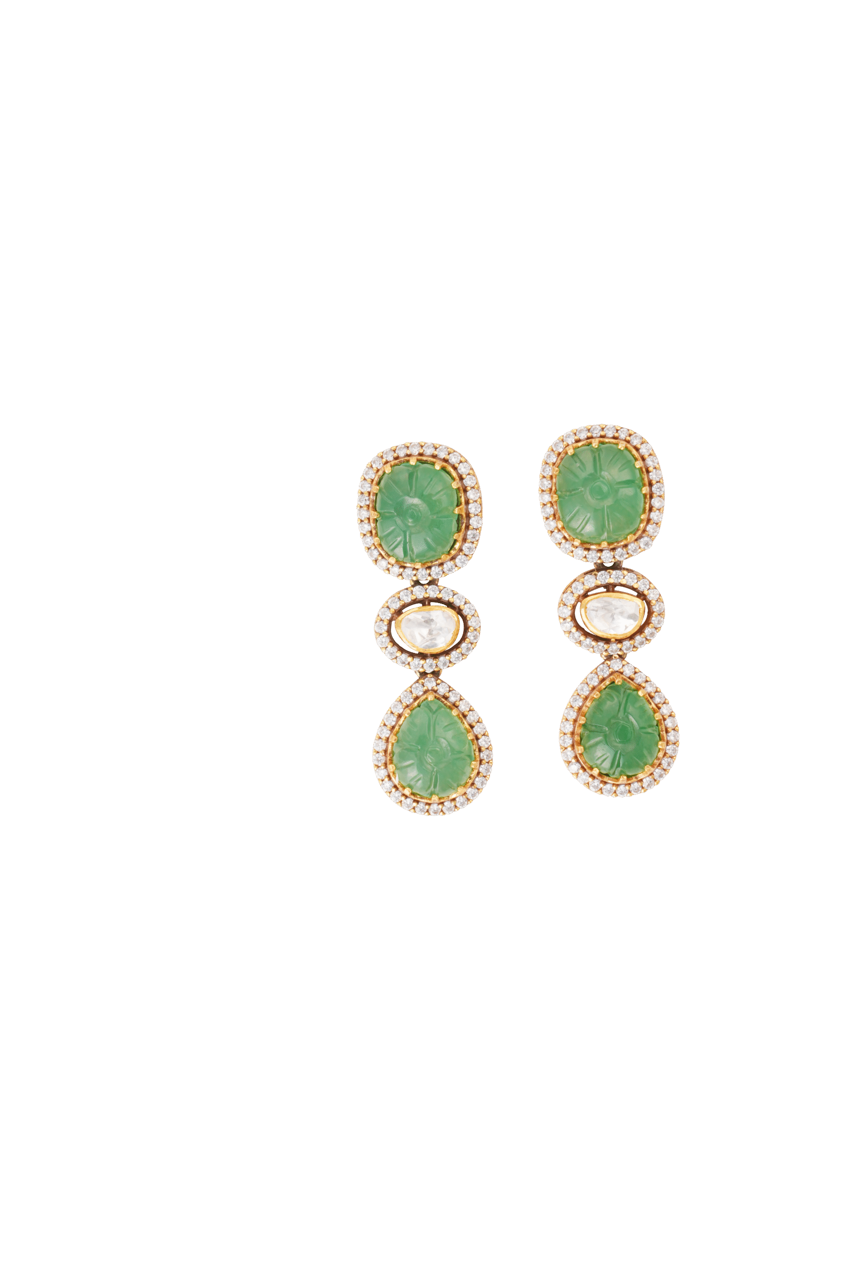 Inspired by the ornate gateways of lush green Mughal gardens (“Bagh-e-Sabz”), these earrings feature carved emeralds flanking a luminous white accent, framed by delicate sparkle