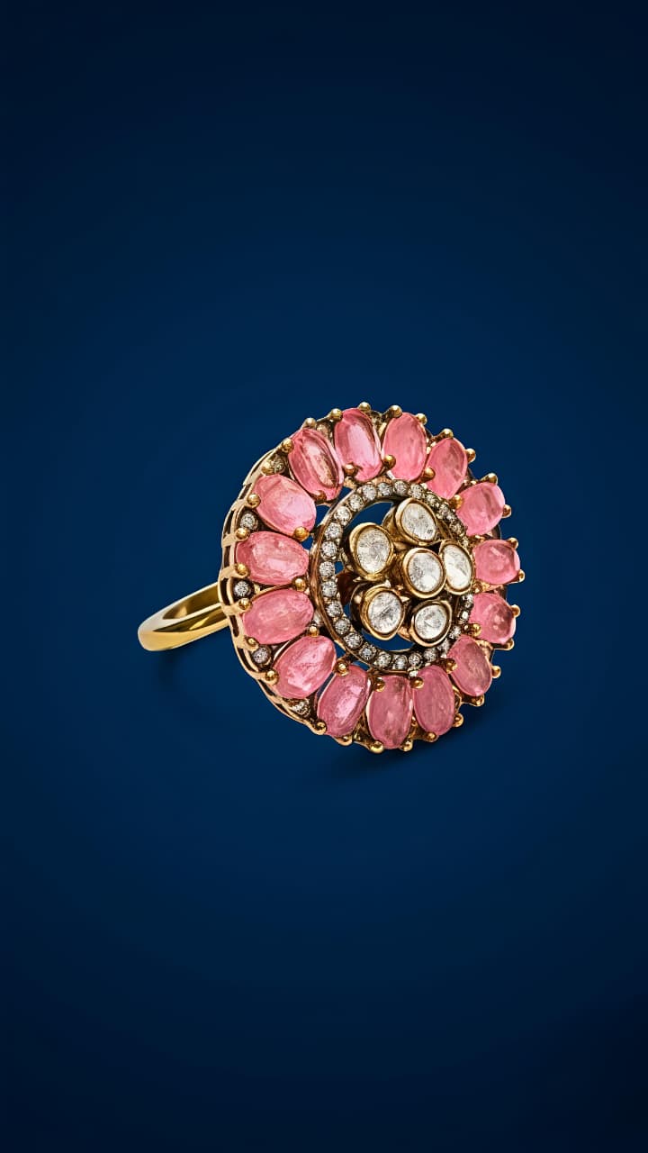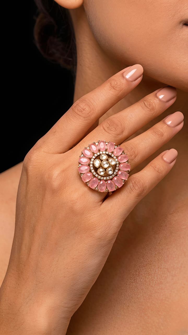 Elegant silver ring with pink colourstones in a floral halo, centered with sparkling moissanite and CZ stones. Perfect for statement wear.