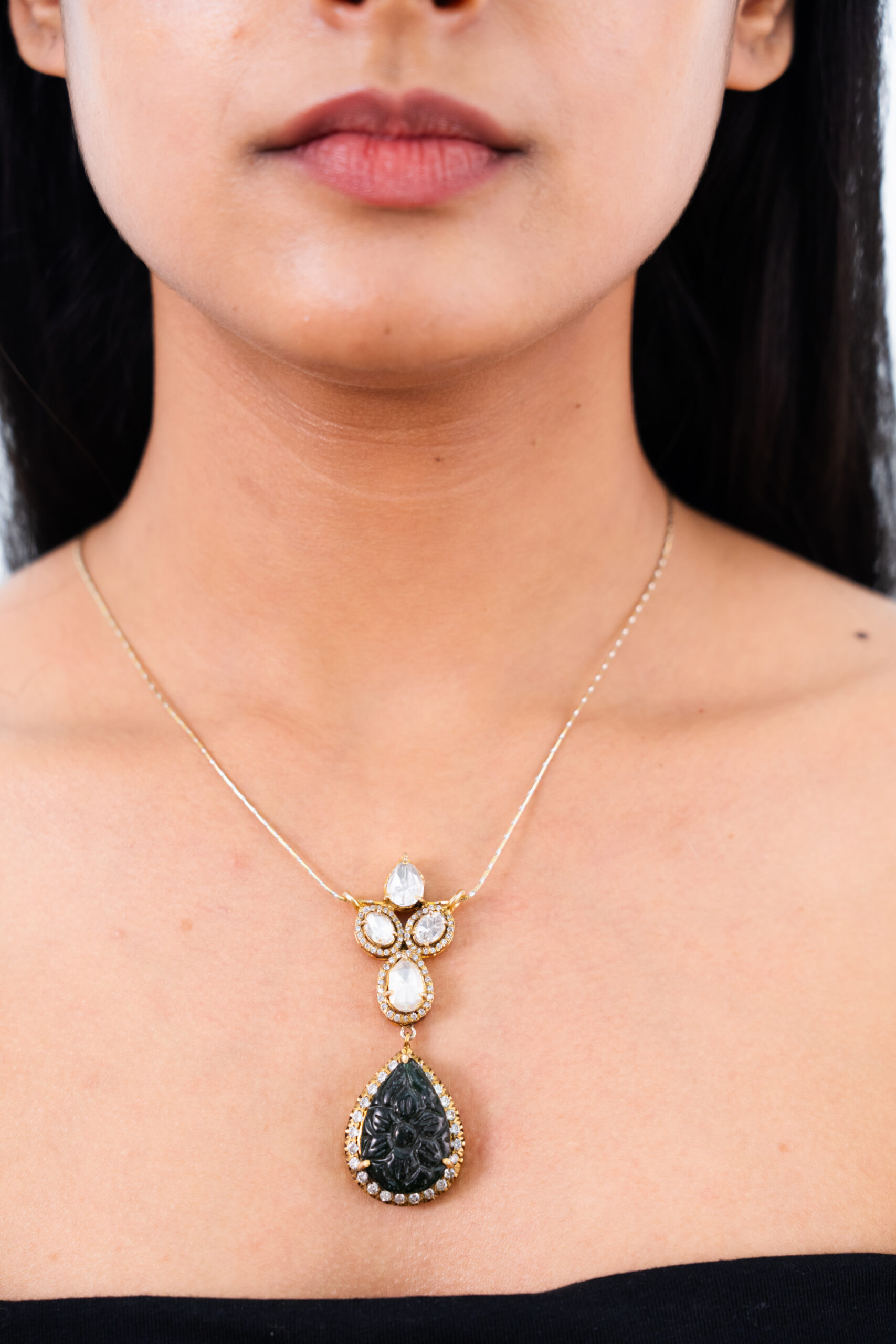 This necklace features a captivating teardrop pendant with an intricately carved emerald, complemented by a cluster of luminous white stones, creating a unique blend of artistry and natural beauty perfect for your style.