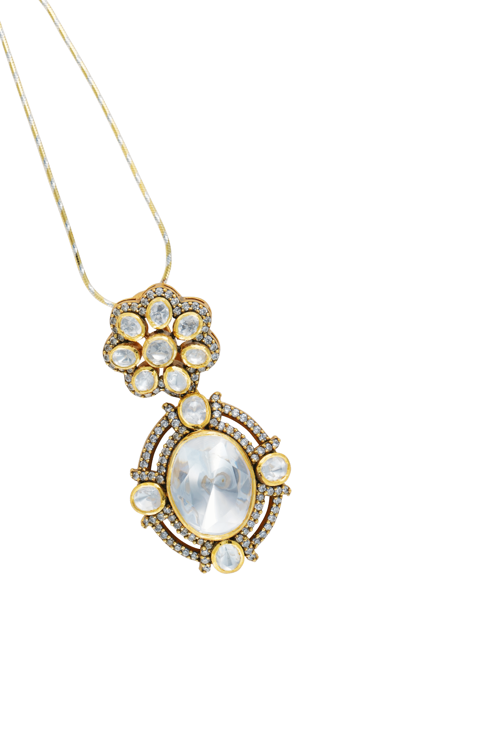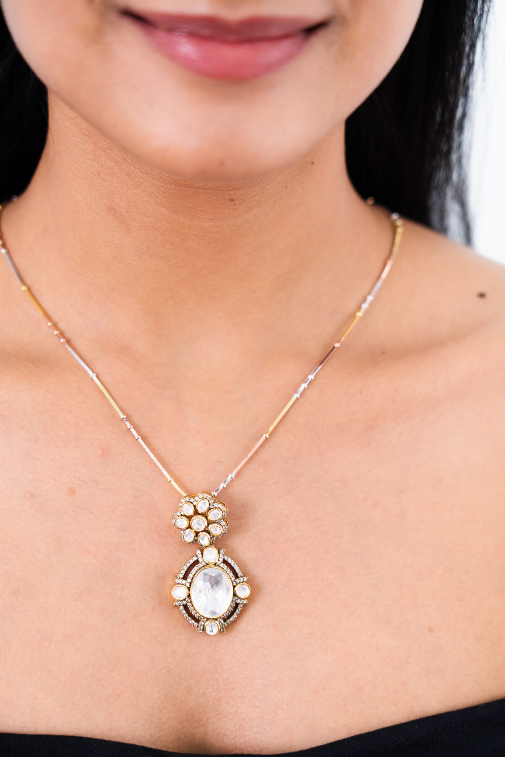 Evoking the soft glow of the moon (“chandra”), these square and floral pendants feature central luminous stones, bringing a touch of celestial elegance