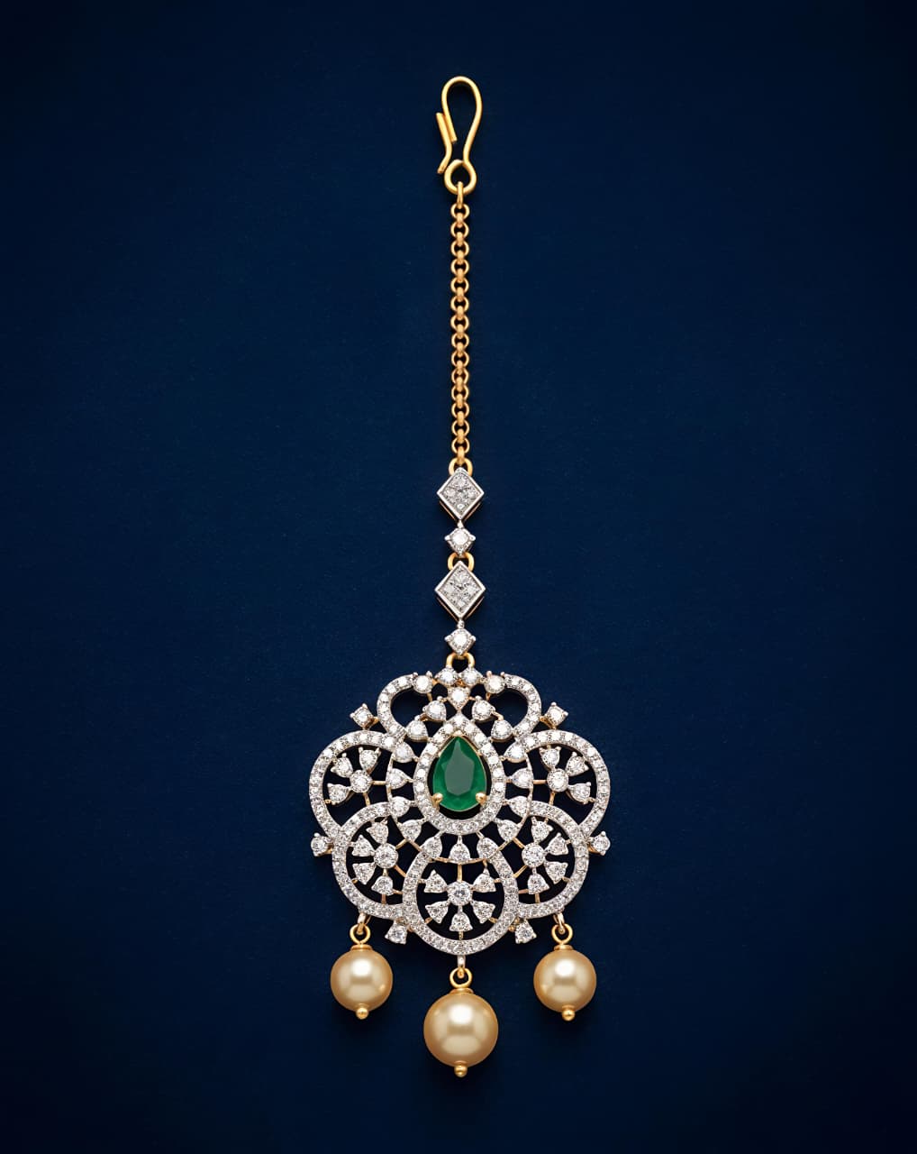 Be the first to review “Classic Silver Maang Tikka with Moissanite, CZ & Green Colourstone with Pearl Drops”