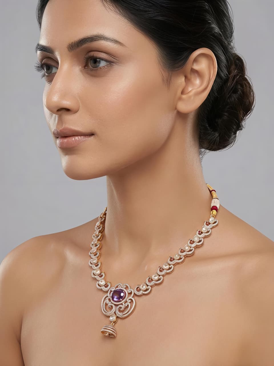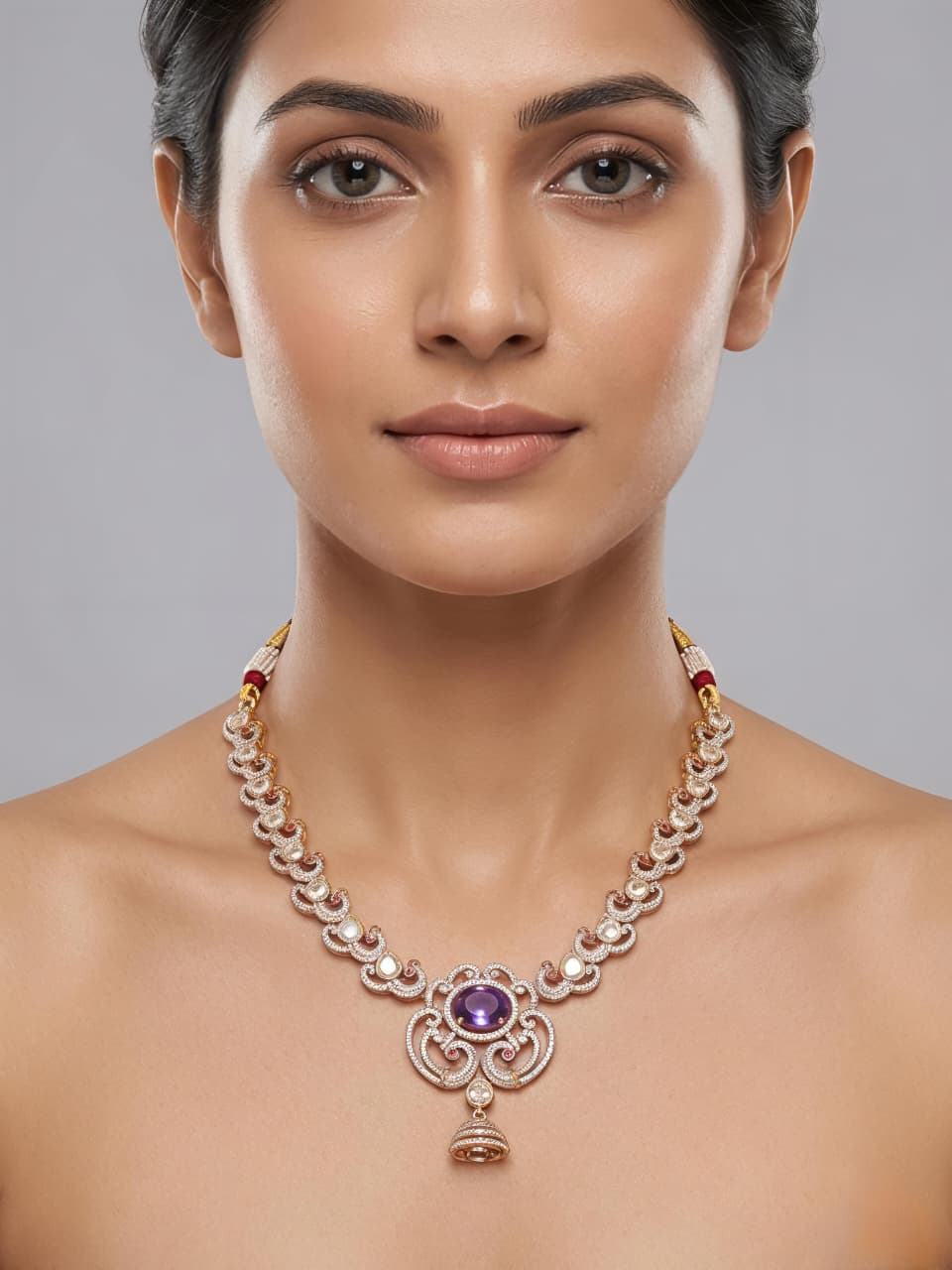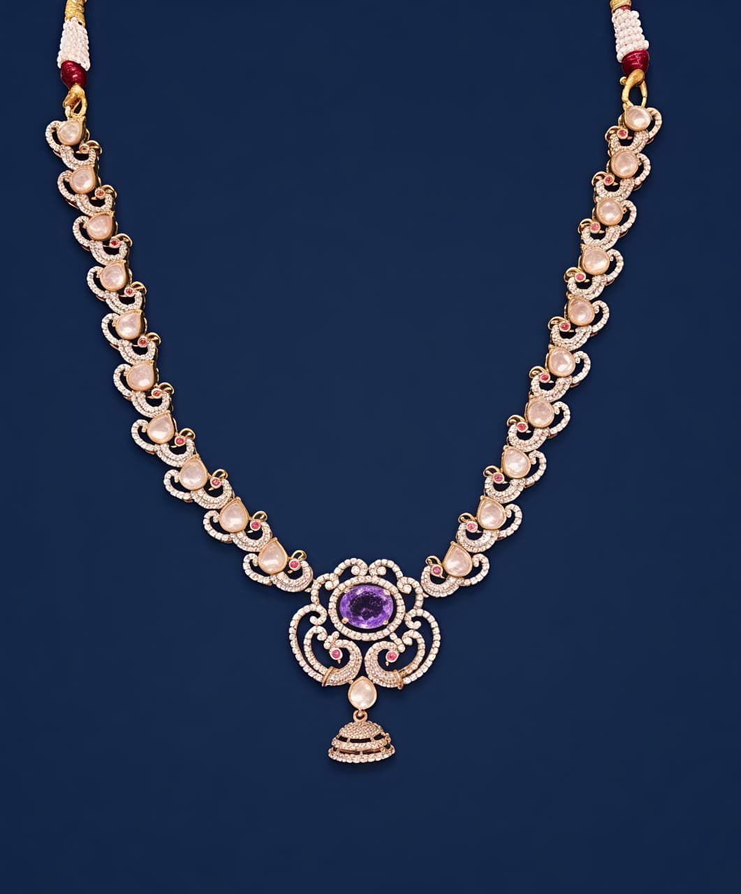 Make a statement with this elegant designer necklace crafted in 92.5 sterling silver, beautifully studded with sparkling moissanite, high-quality CZ, and soft-toned colourstones. The intricate linked pattern leads to a stunning centerpiece featuring a vibrant stone, delicate detailing, and a graceful pearl drop pendant.Blending modern sophistication with traditional charm, this necklace is perfect for weddings, festive occasions, and special events.