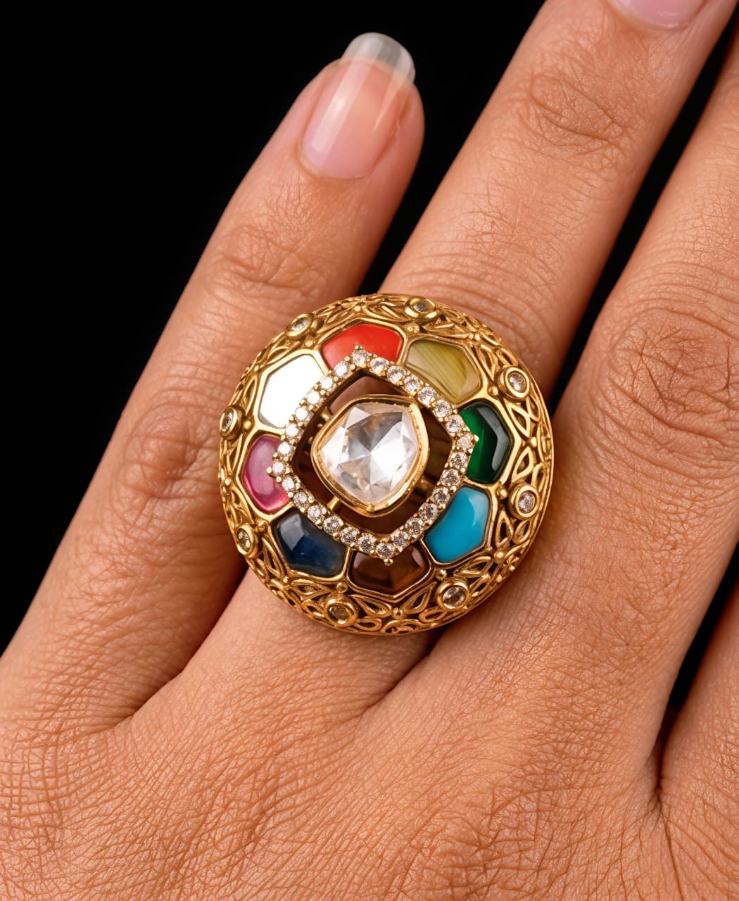 Elegant silver ring featuring a central moissanite, accented with sparkling CZ and vibrant color stones in a detailed designer setting. Perfect for statement wear.