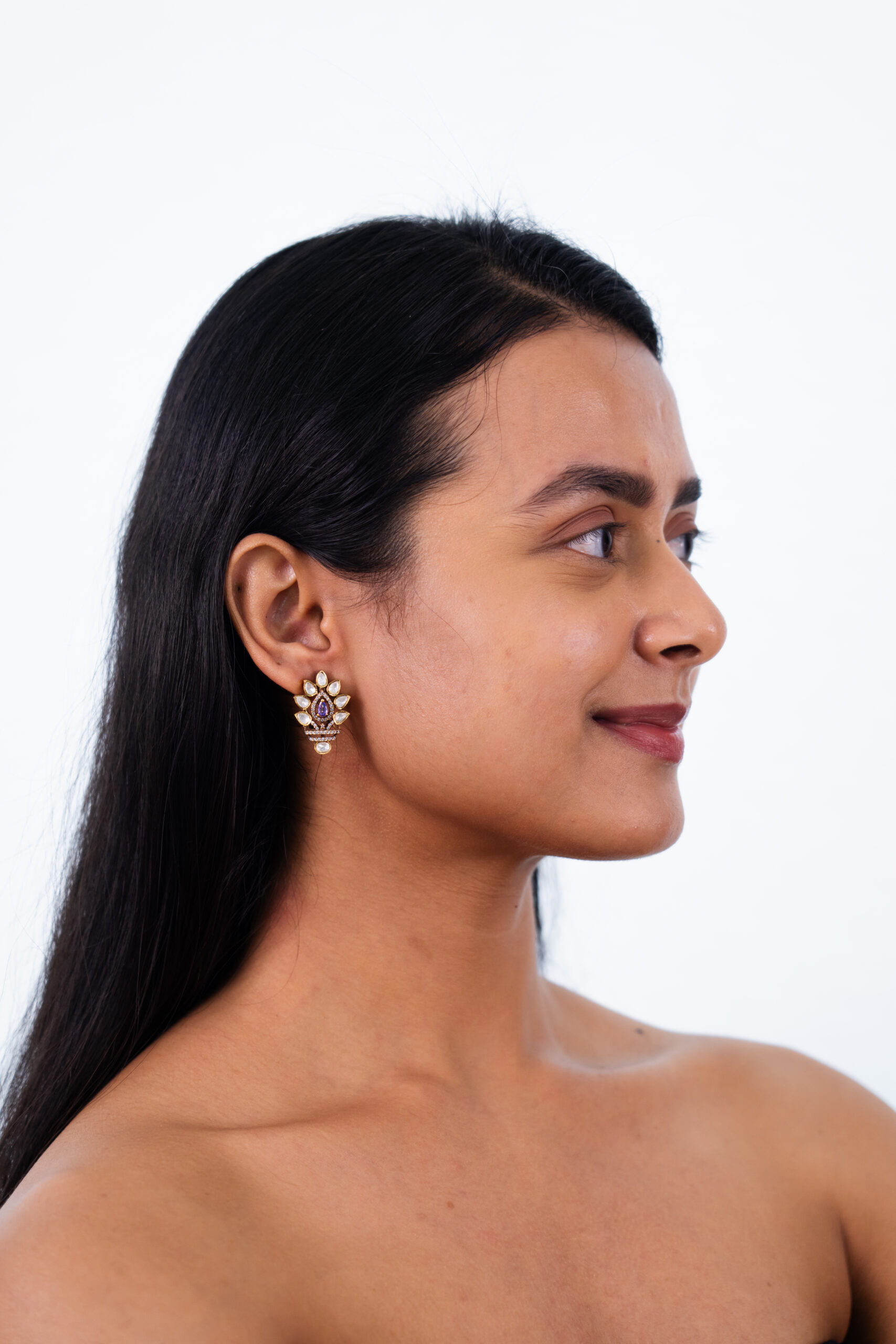 These earrings offer a harmonious contrast between the rich purple radiance of amethyst and the soft luminescence of uniquely shaped white stones, all enhanced by delicate sparkle. A balanced and elegant design for your jewelry collection.