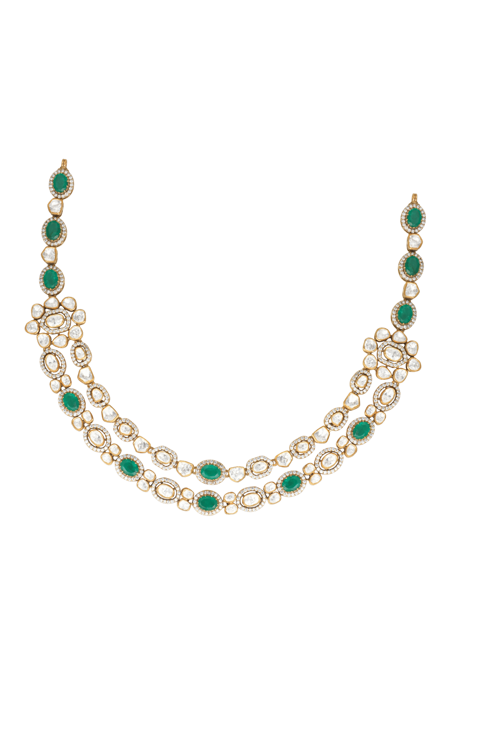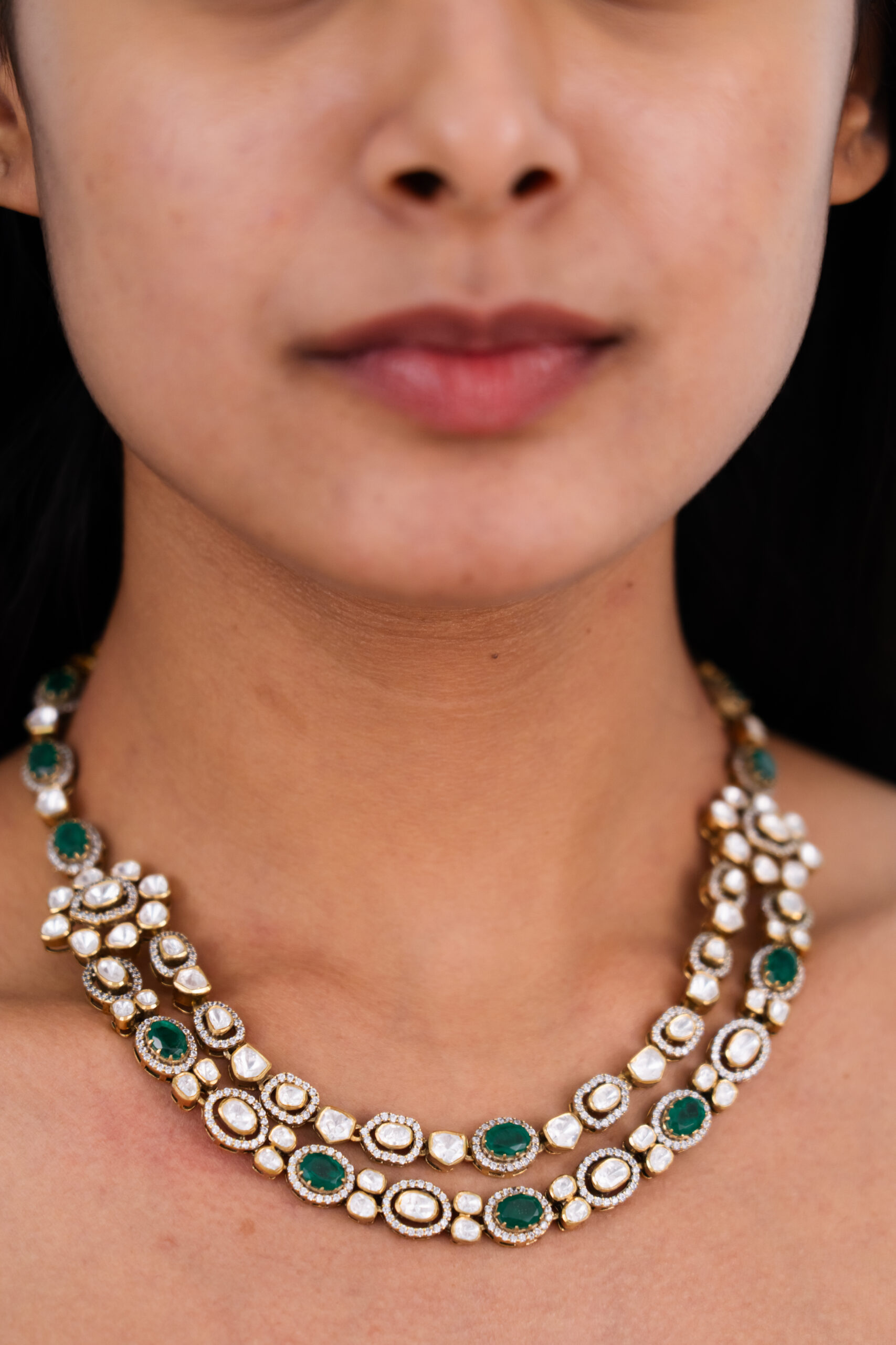 This necklace features two strands, each showcasing vibrant emerald accents and luminous mozonite stones, framed by delicate Swarovski crystals, creating a layered elegance