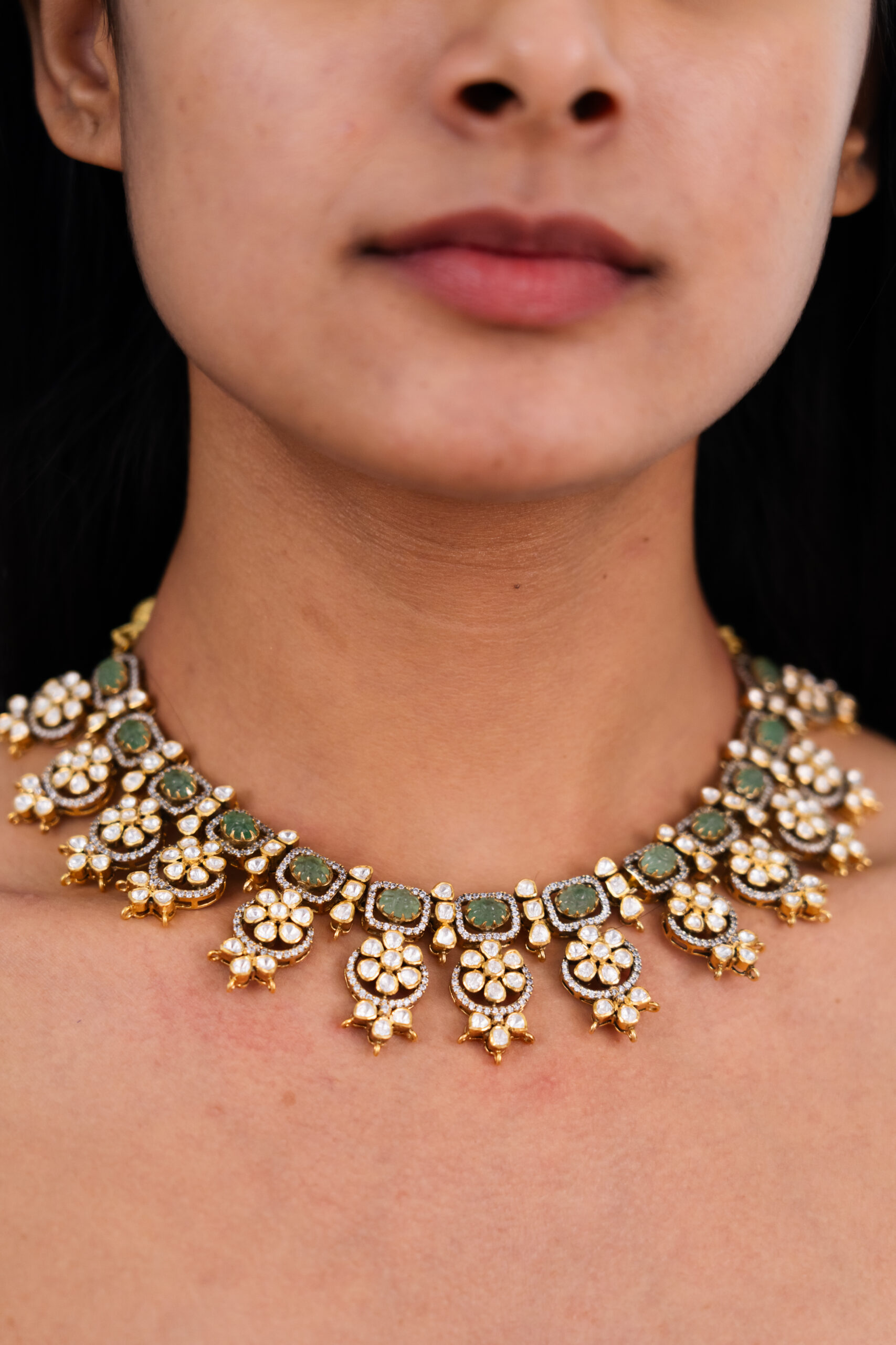 A flowing arrangement of floral mozonite motifs and vibrant emerald accents, each surrounded by the delicate glow of Swarovski crystals, creates a refined and elegant choker for your wardrobe.