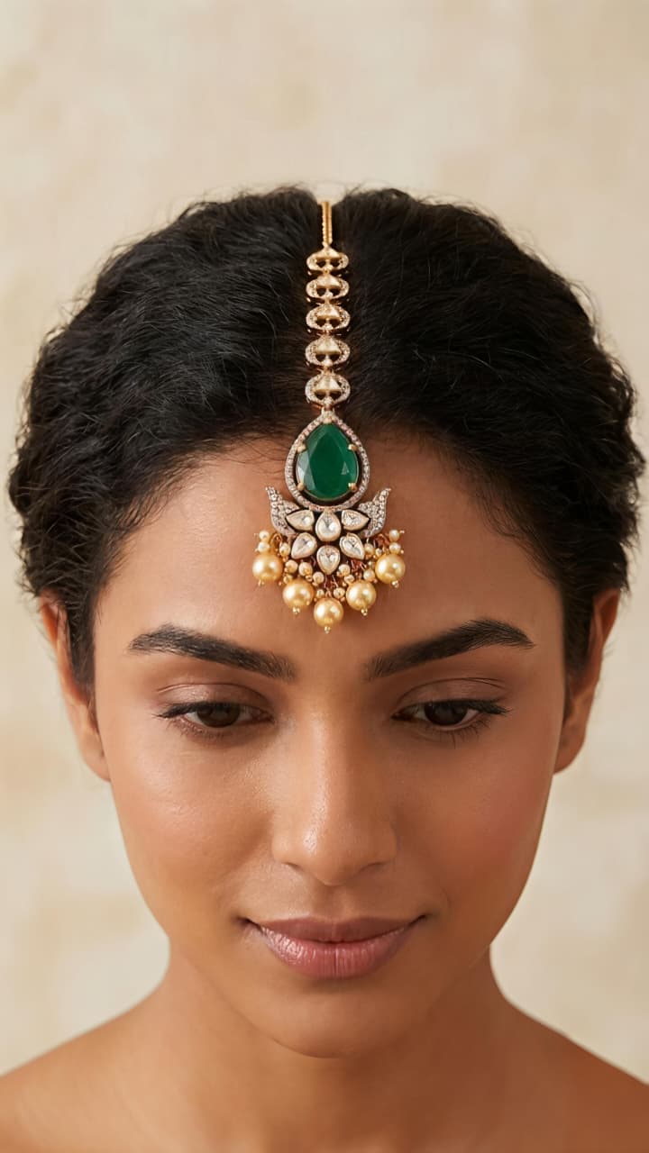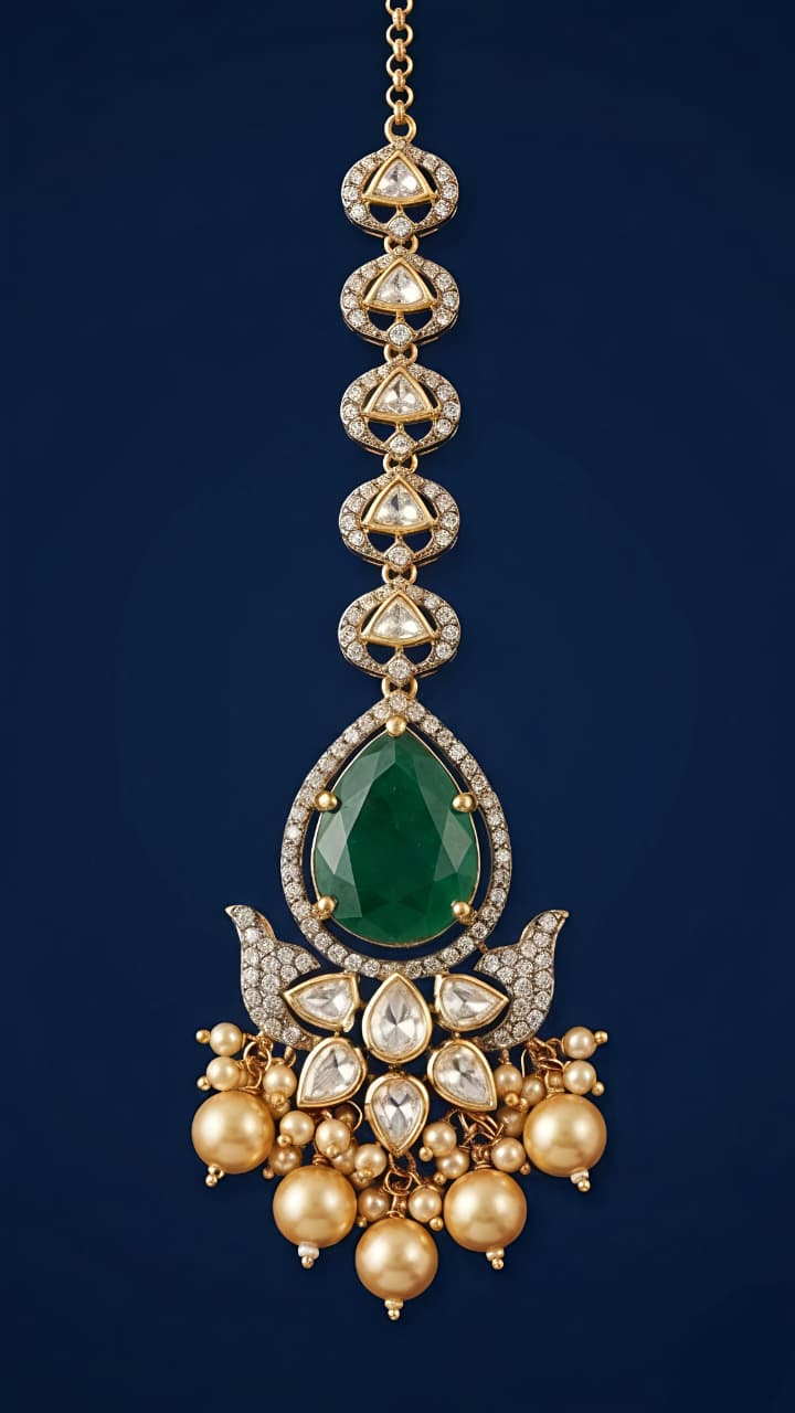 Make a statement with this exquisite silver pendant, beautifully studded with shimmering moissanite and sparkling CZ stones. The design features a striking emerald-green teardrop centerpiece, gracefully framed with fine detailing and linked motifs for a regal look. The lower section is adorned with intricate stonework and elegant pearl dangles, adding movement and charm. Perfect for festive occasions, weddings, or evening wear, this piece blends traditional elegance with contemporary sophistication.