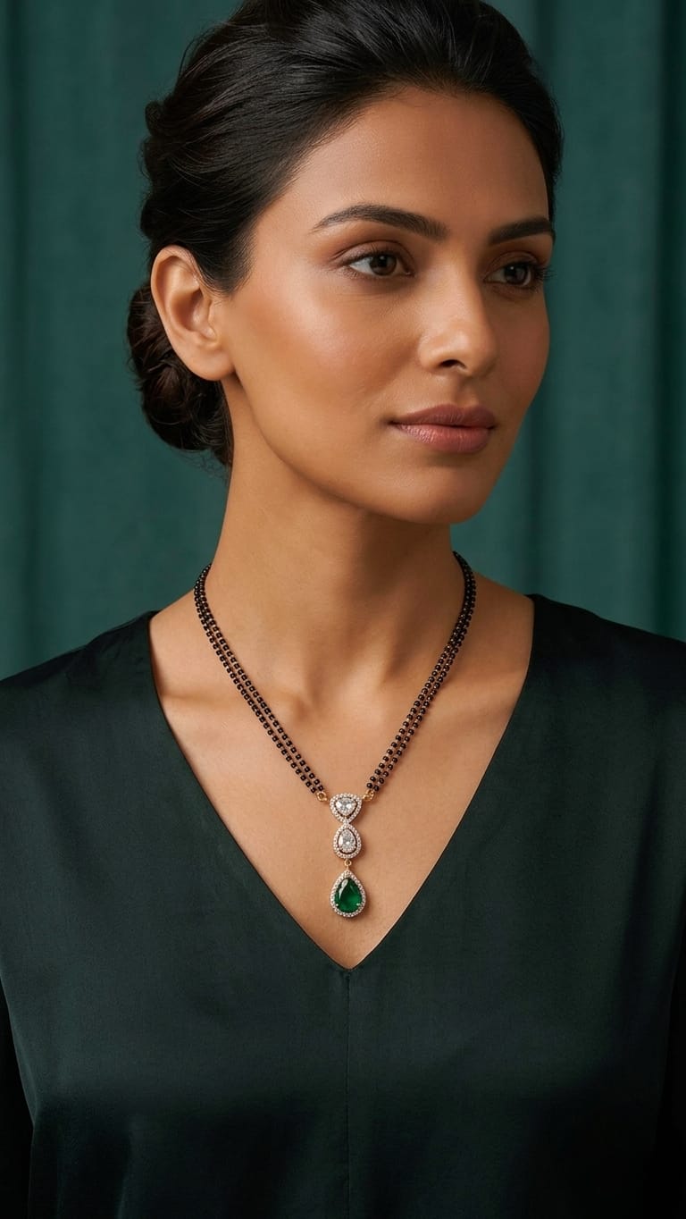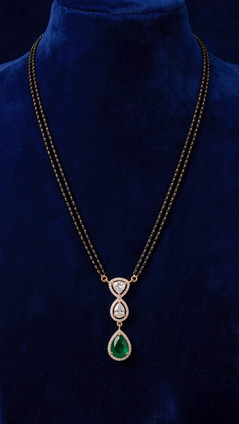 Elegant double-chain mangalsutra with a sparkling moissanite pendant and emerald-tone drop. Perfect blend of tradition and modern style.