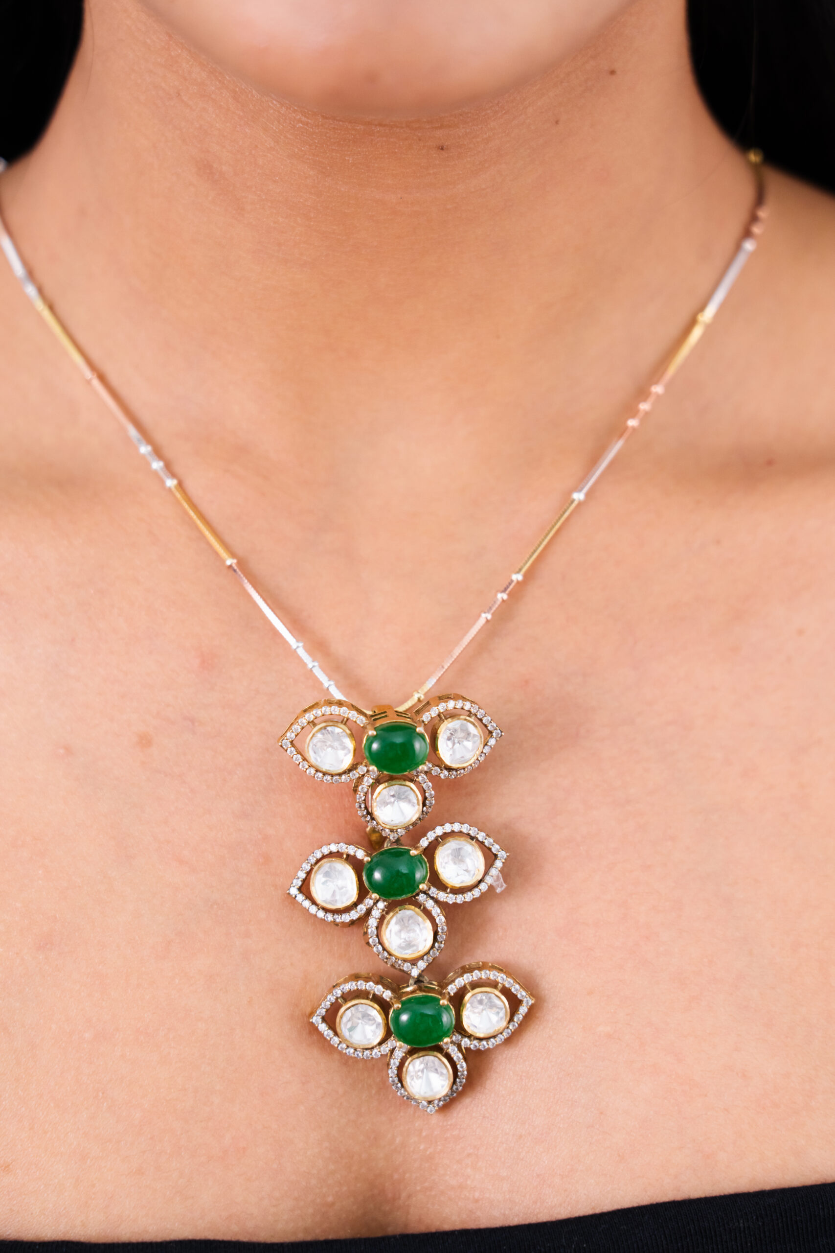 This necklace features a captivating trio of floral motifs, each showcasing vibrant emeralds nestled between luminous white stones, creating a garden-inspired elegance perfect for adding a touch of nature to your style.