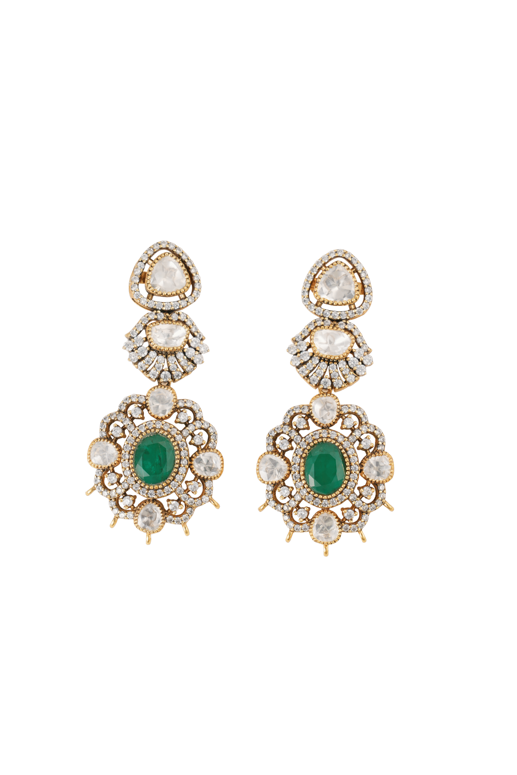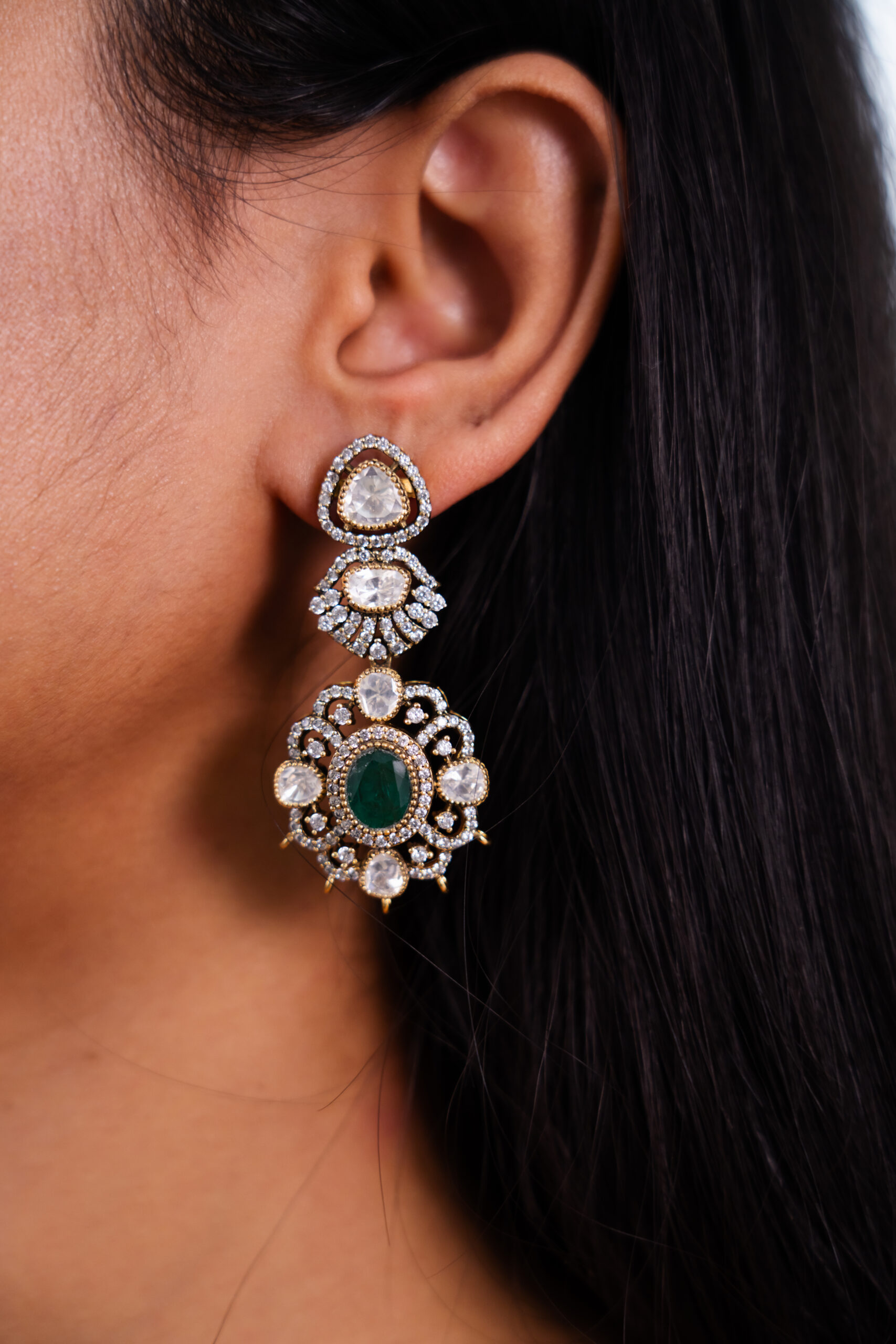 Adorn your ears with this exquisite design: a rich oval emerald surrounded by a dazzling array of uniquely cut mozonite stones, all enhanced by the delicate sparkle of Swarovski crystals.