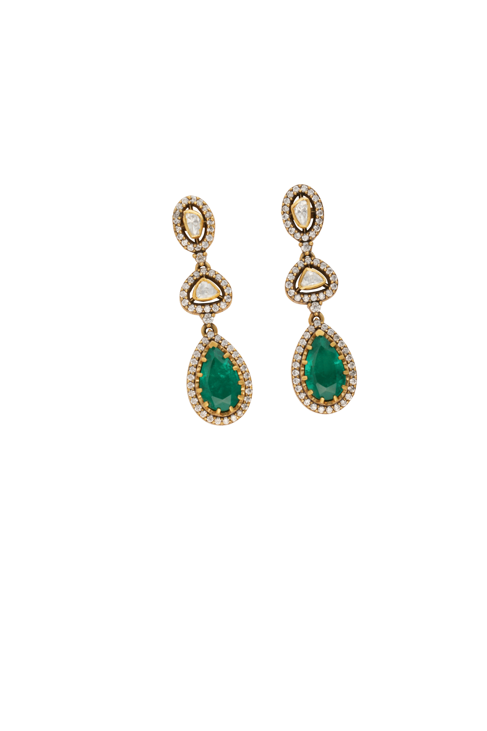 Adorn your ears with this beautiful arrangement: a rich pear-shaped emerald leading to a dazzling duo of uniquely cut mozonite stones, all enhanced by the delicate sparkle of Swarovski crystals.