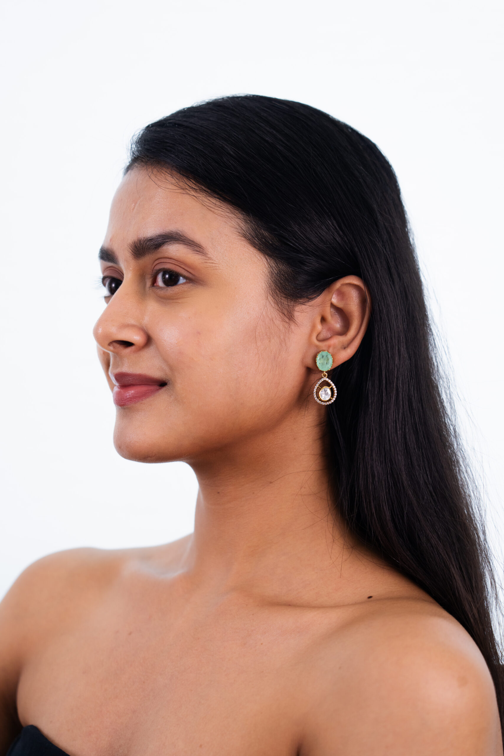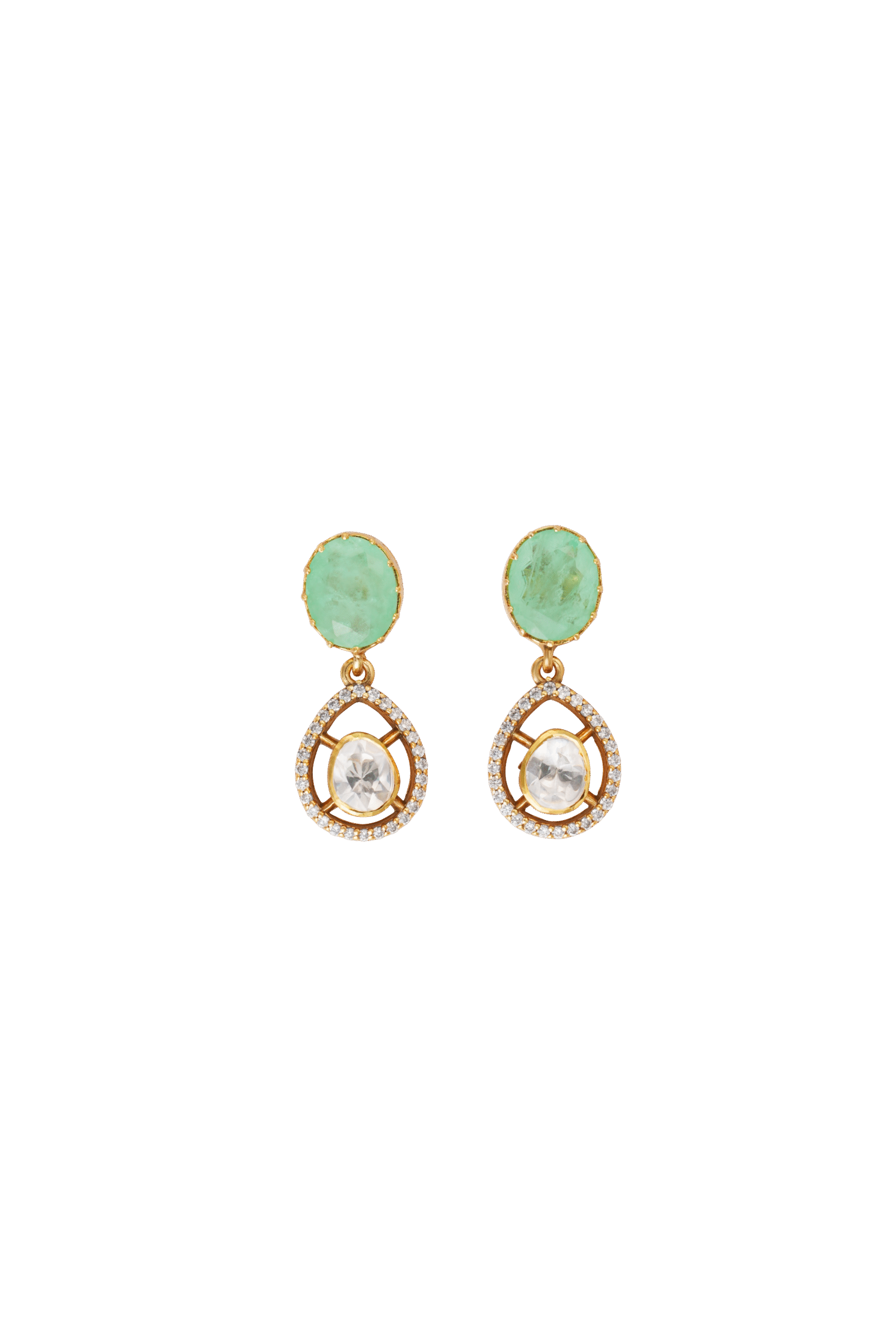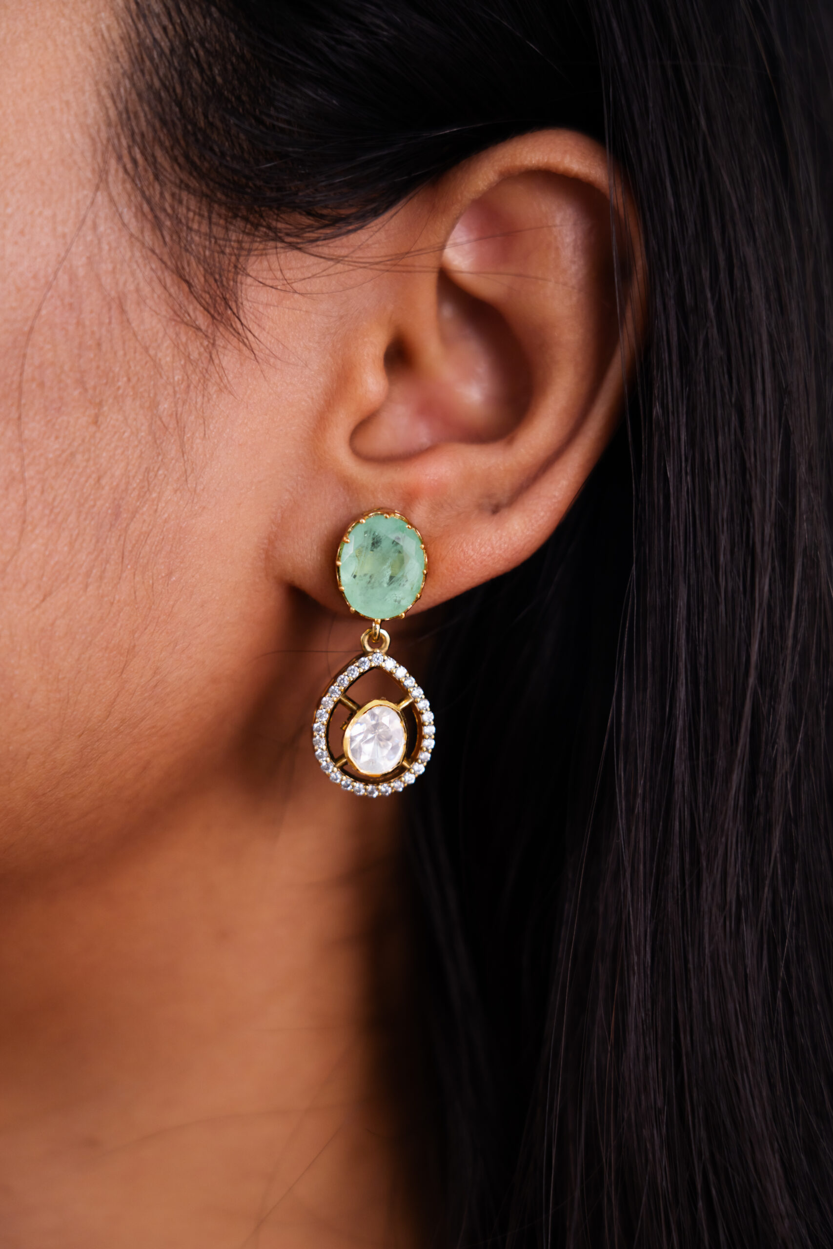These earrings offer a balanced equilibrium between a luminous white gemstone and a soft green gemstone, both embraced by delicate sparkle, creating a sophisticated and harmonious design