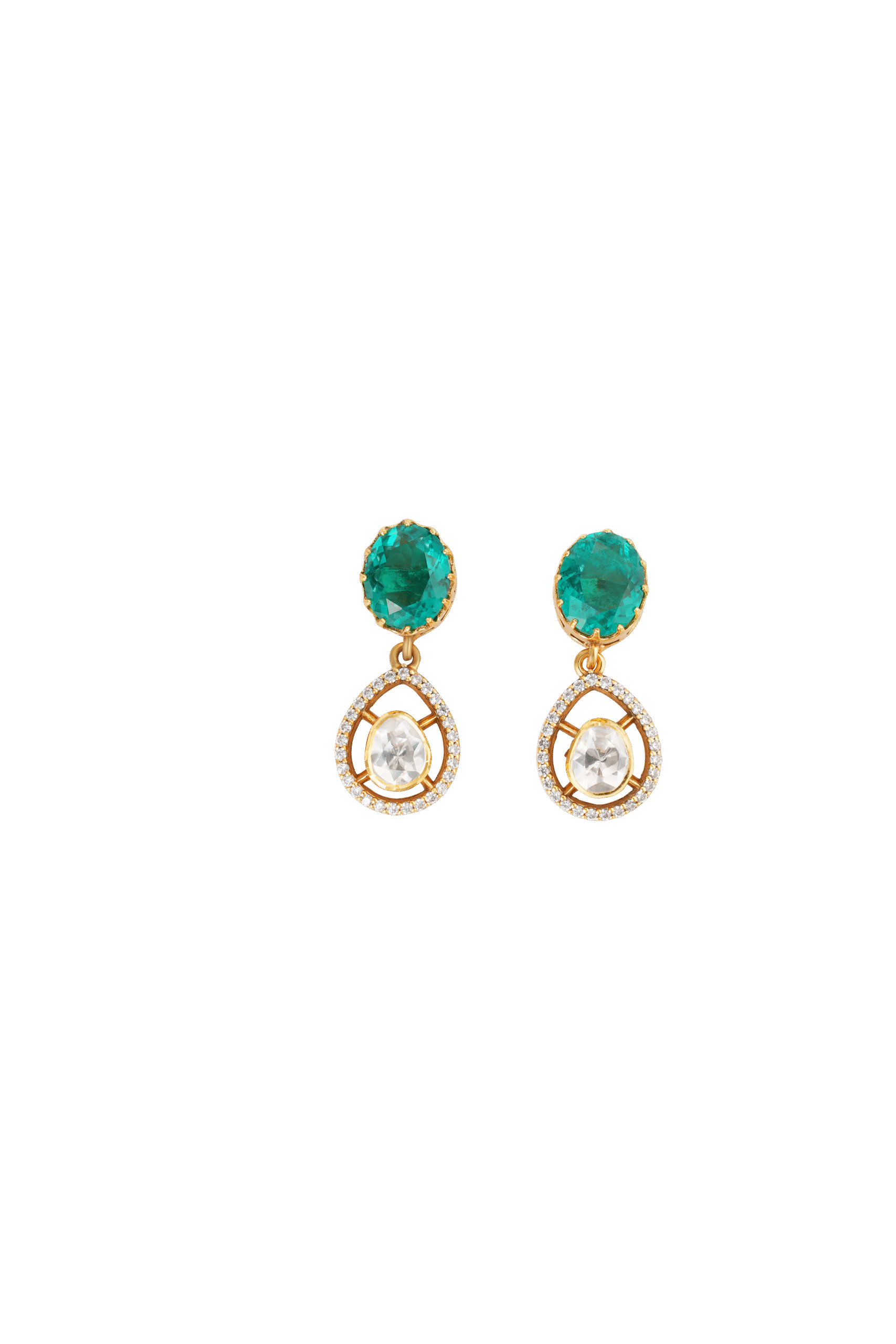 These earrings present a unique connection between a luminous white gemstone and a vibrant emerald, both outlined with delicate, sparkling details, creating a modern and artistic statement