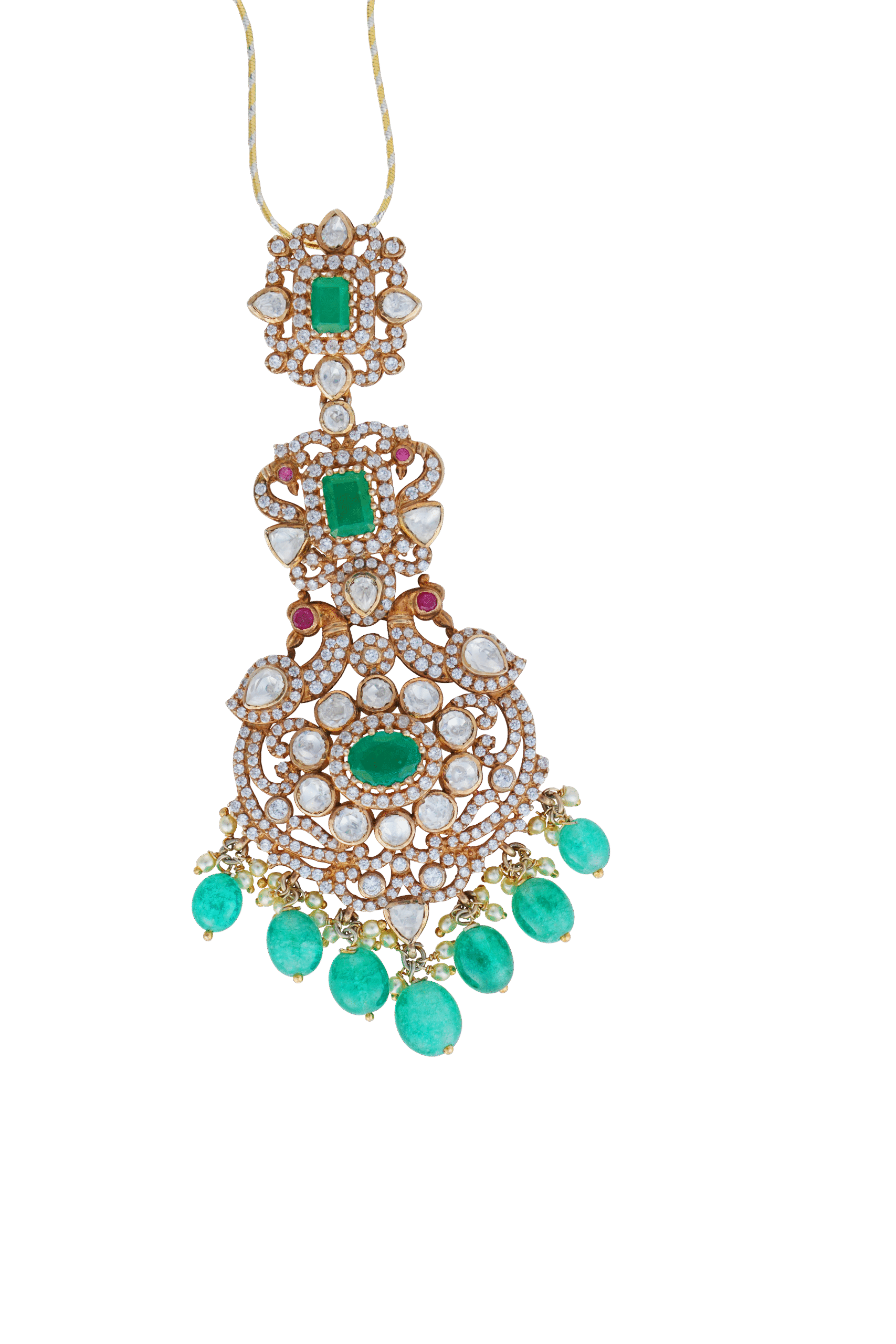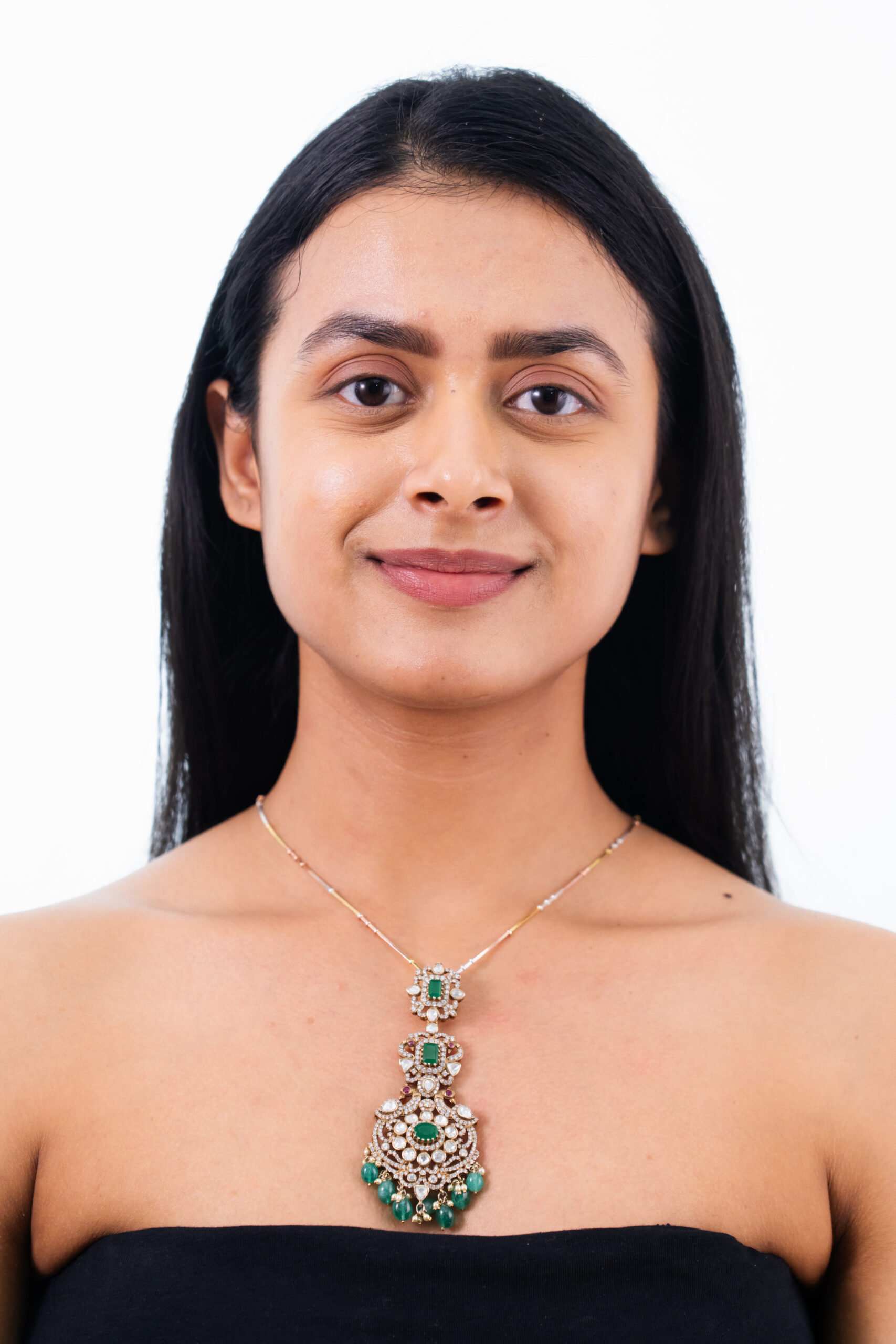 A blend of square and floral pendants, featuring vibrant emeralds and luminous mozonite, accented with delicate Swarovski crystals, creates a harmonious and contemporary design