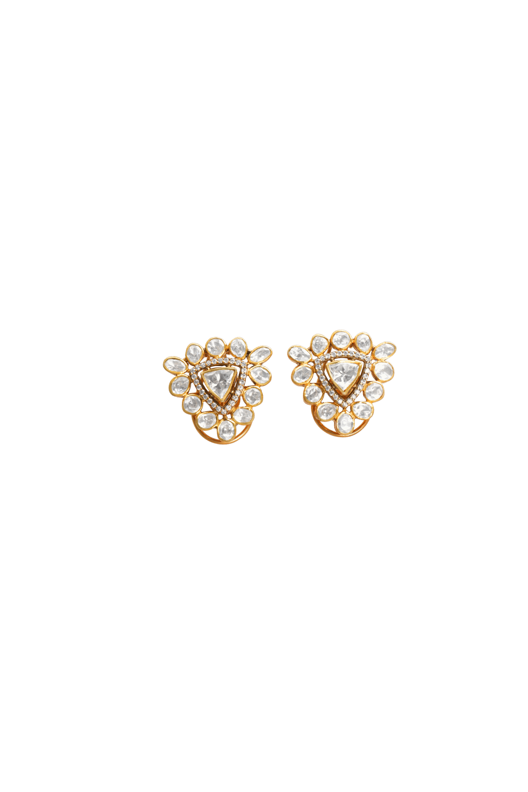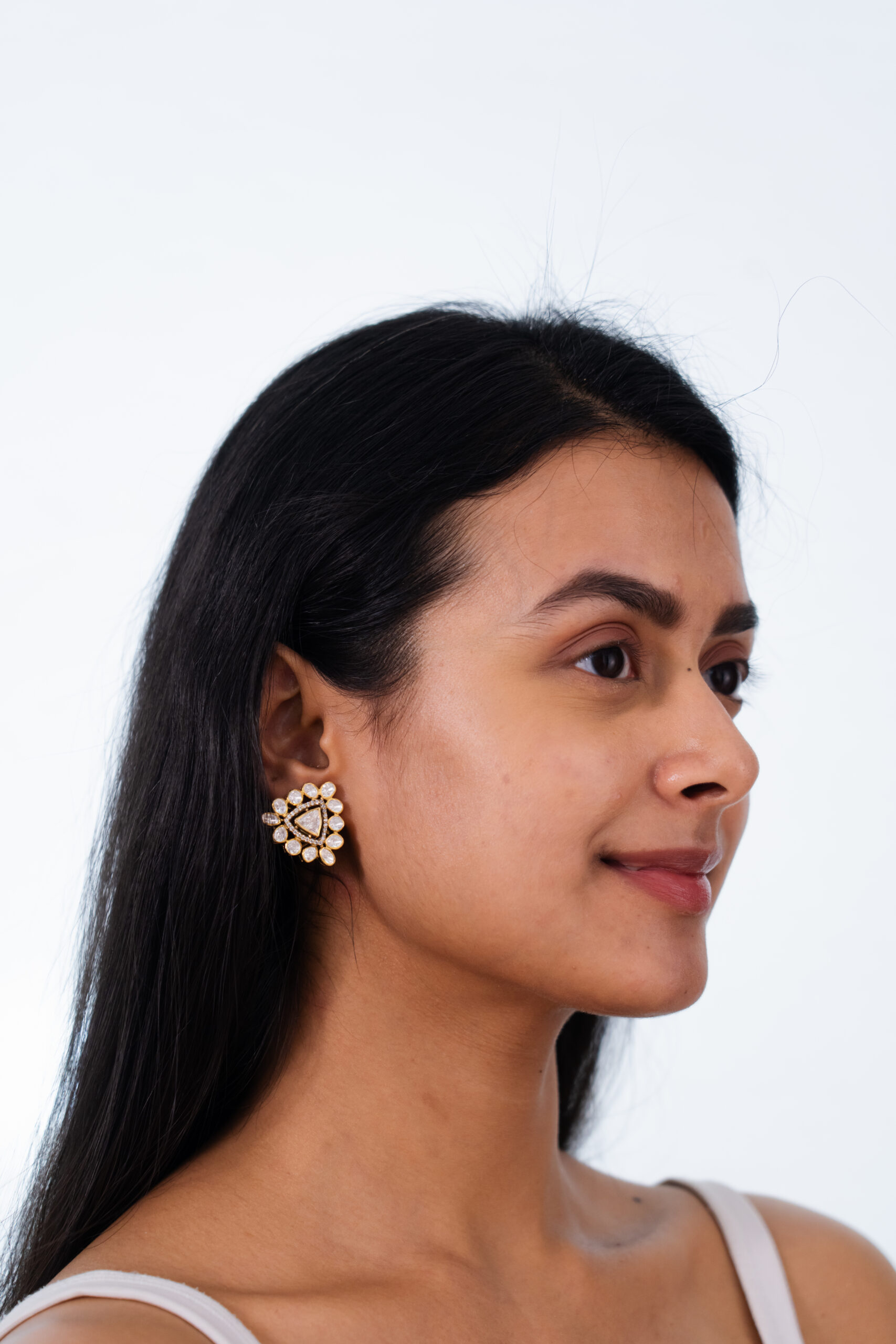These eye-catching stud earrings feature a stylized flower design with a central triangular mozonite and geometrically arranged, shimmering smaller stones.