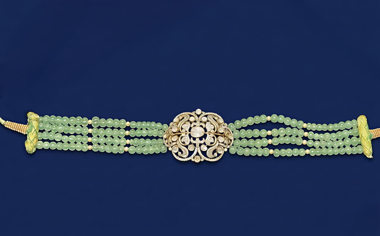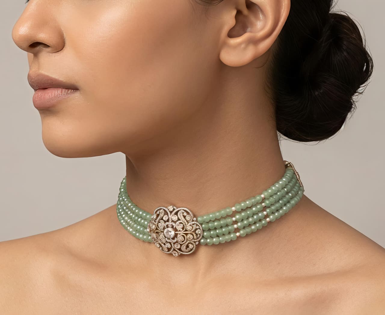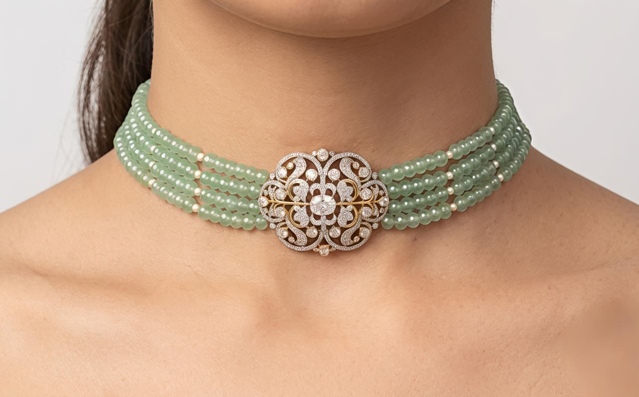 Elegant multi-strand green beaded choker necklace featuring a sparkling moissanite and CZ-studded silver centerpiece—perfect for festive and statement wear.