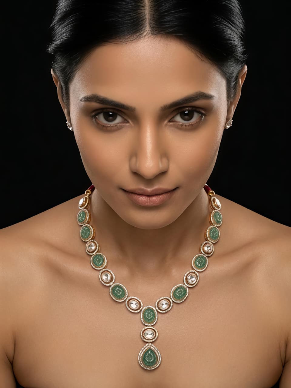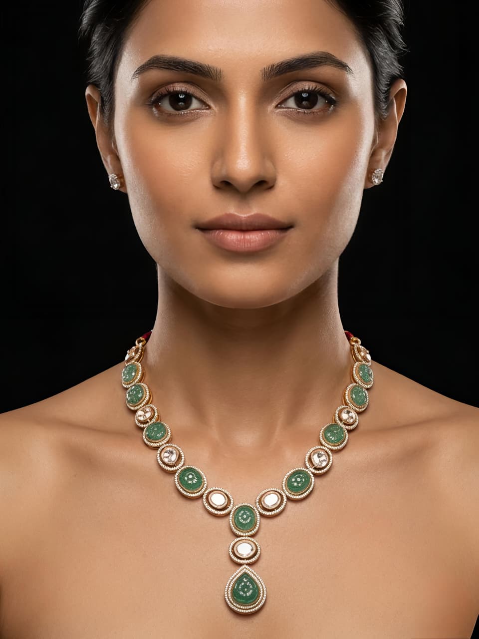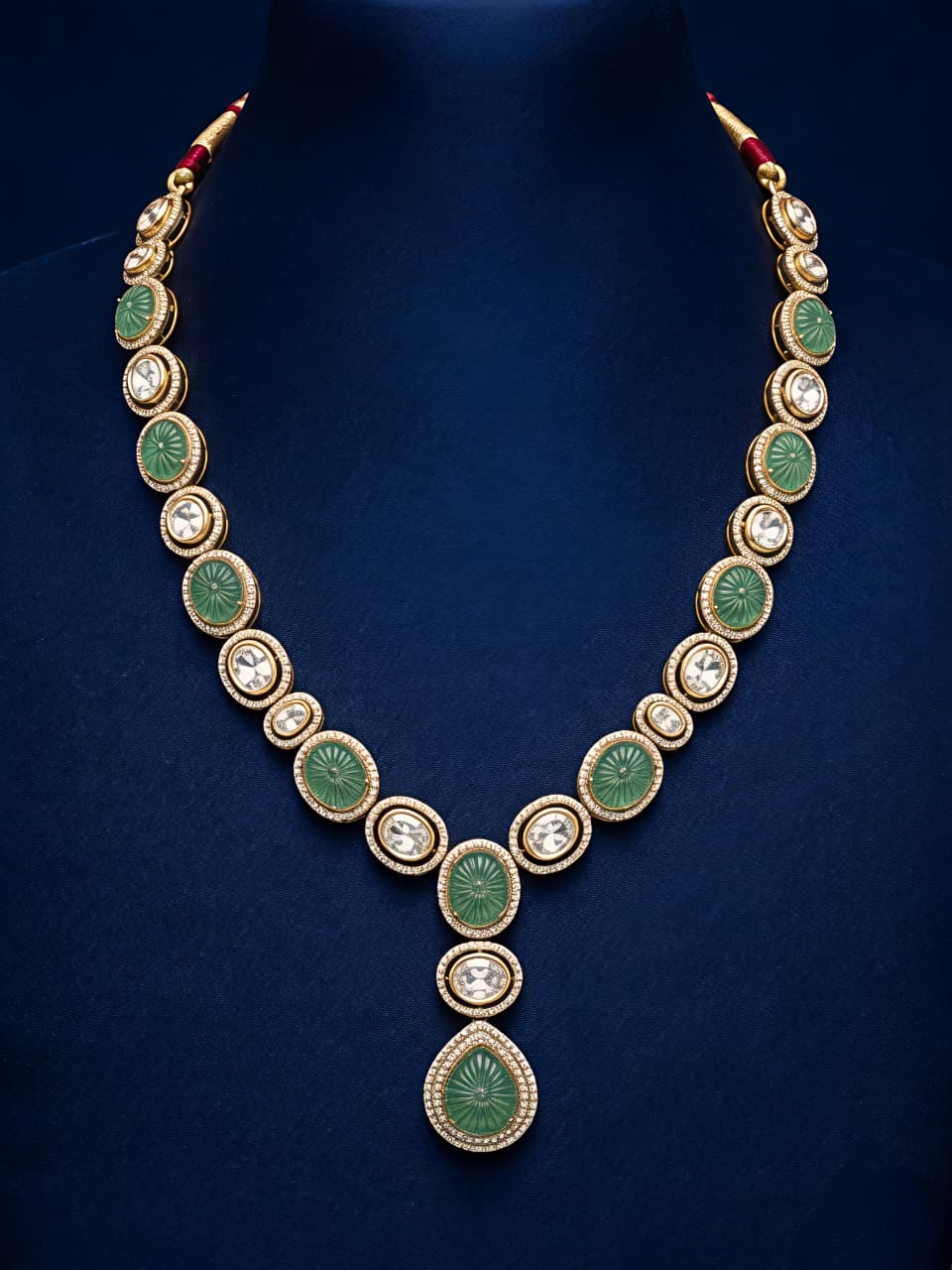 Elegant long silver necklace featuring green colour stones with sparkling moissanite and CZ accents—perfect for festive and statement styling.
