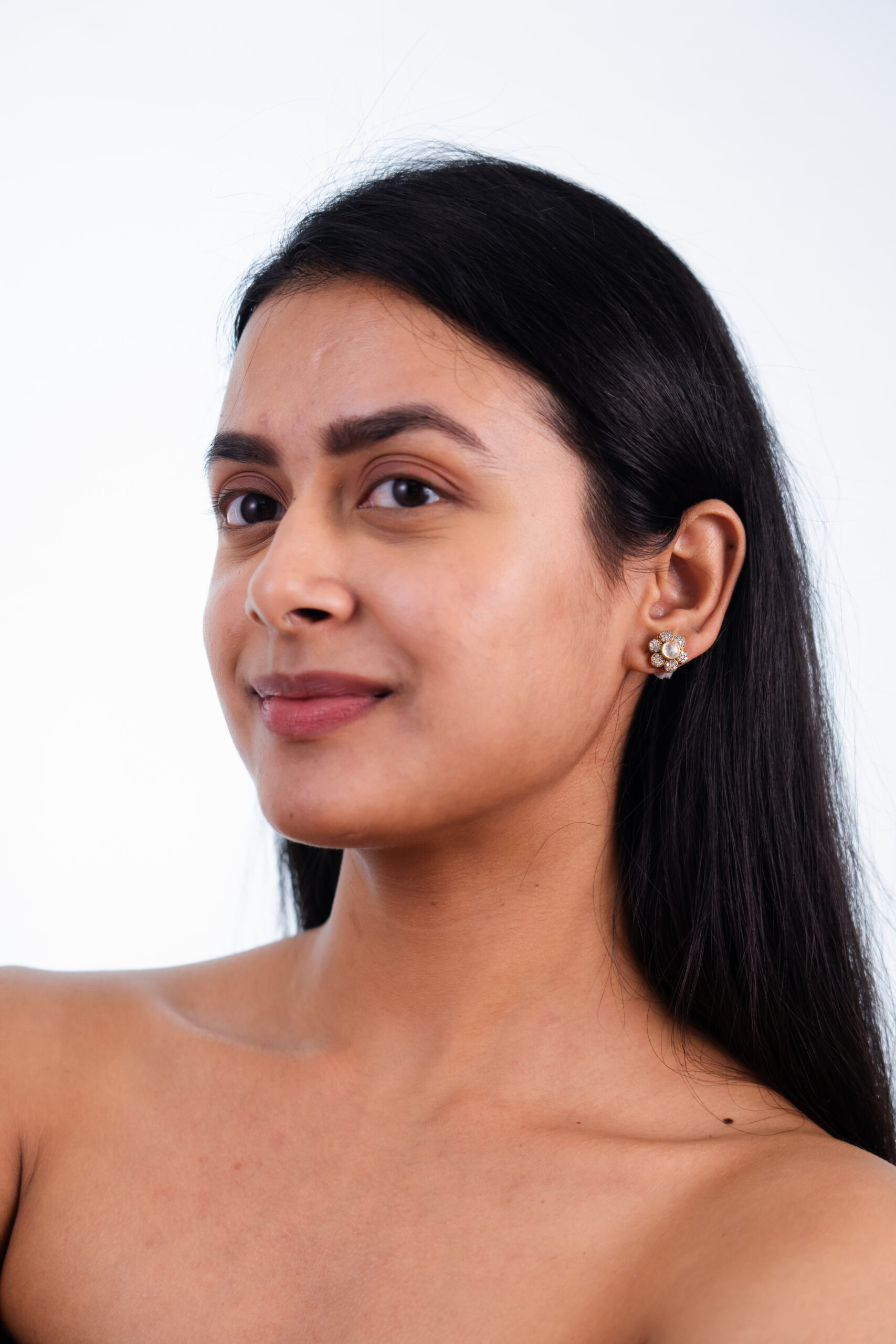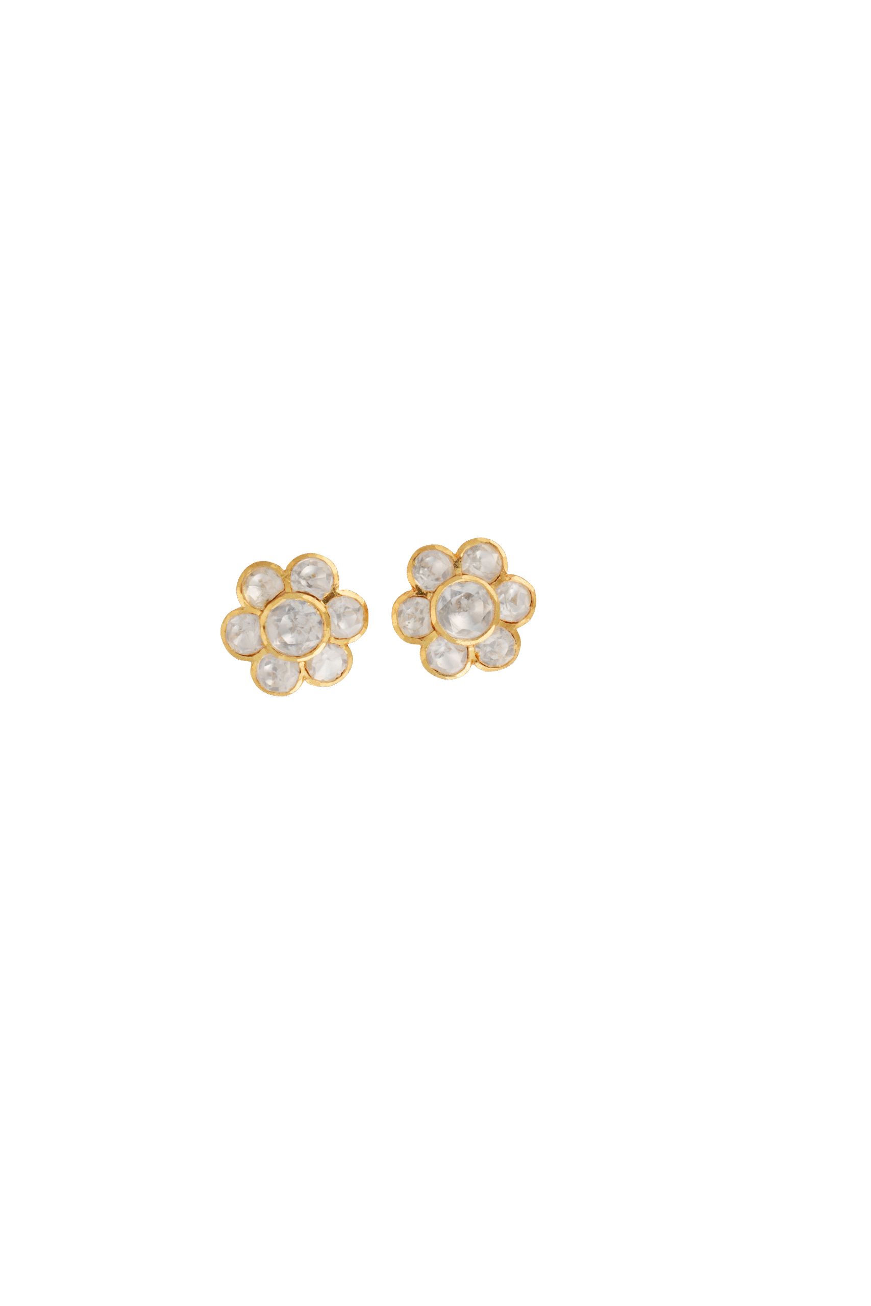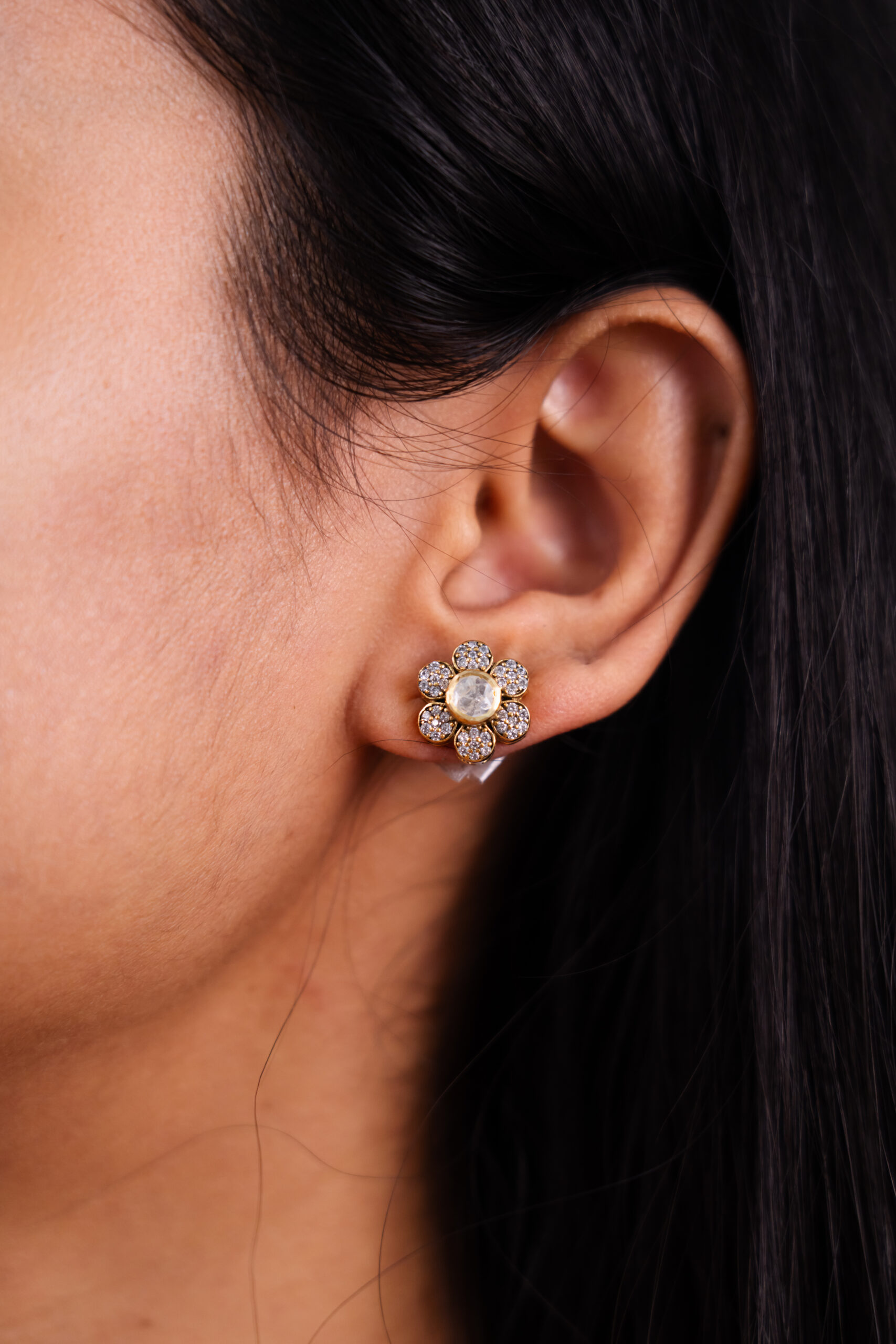 Inspired by the delicate “gulnaar” (pomegranate flower) of Mughal art, these earrings feature a central, luminous gemstone surrounded by a stylized bloom of smaller, sparkling stones.