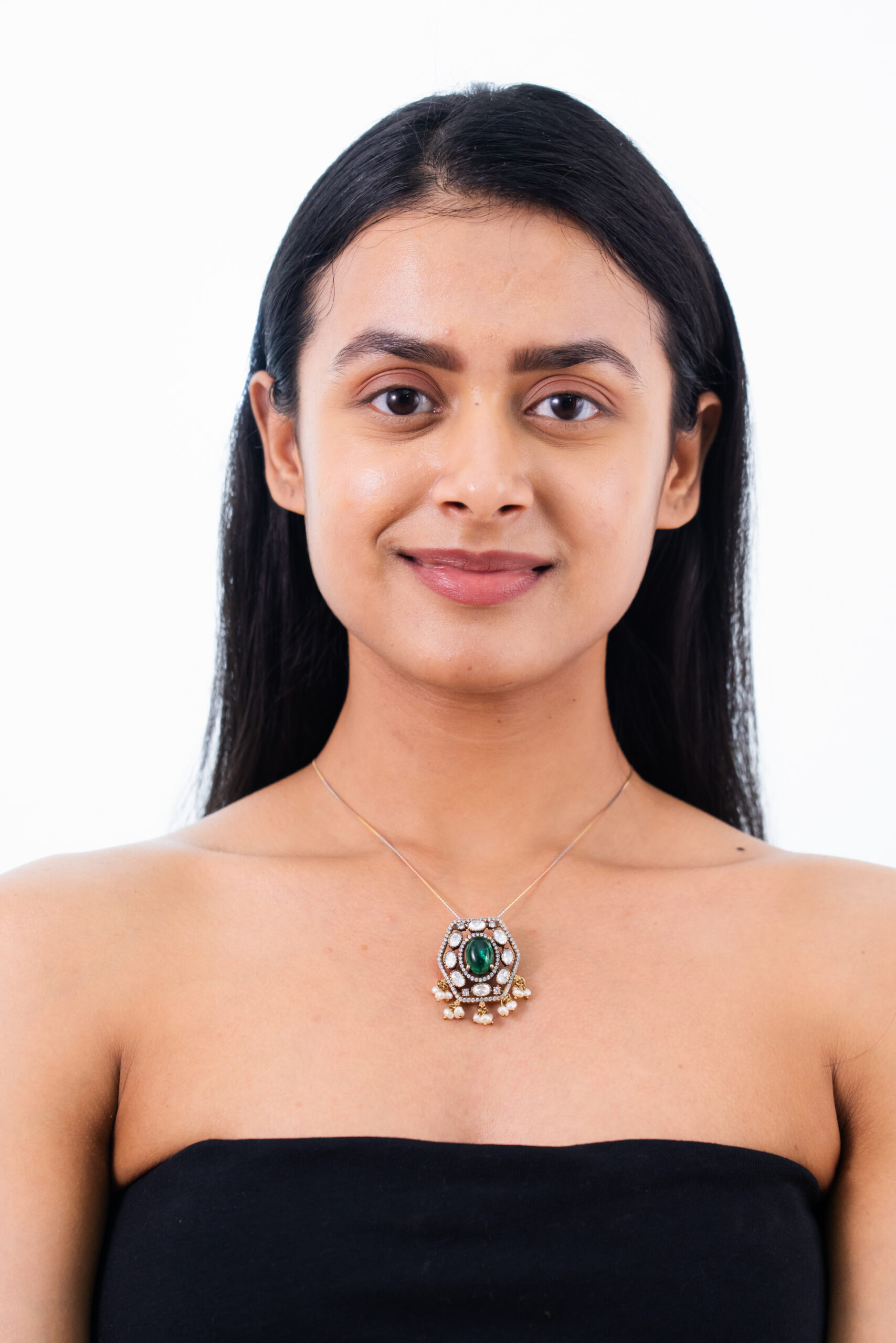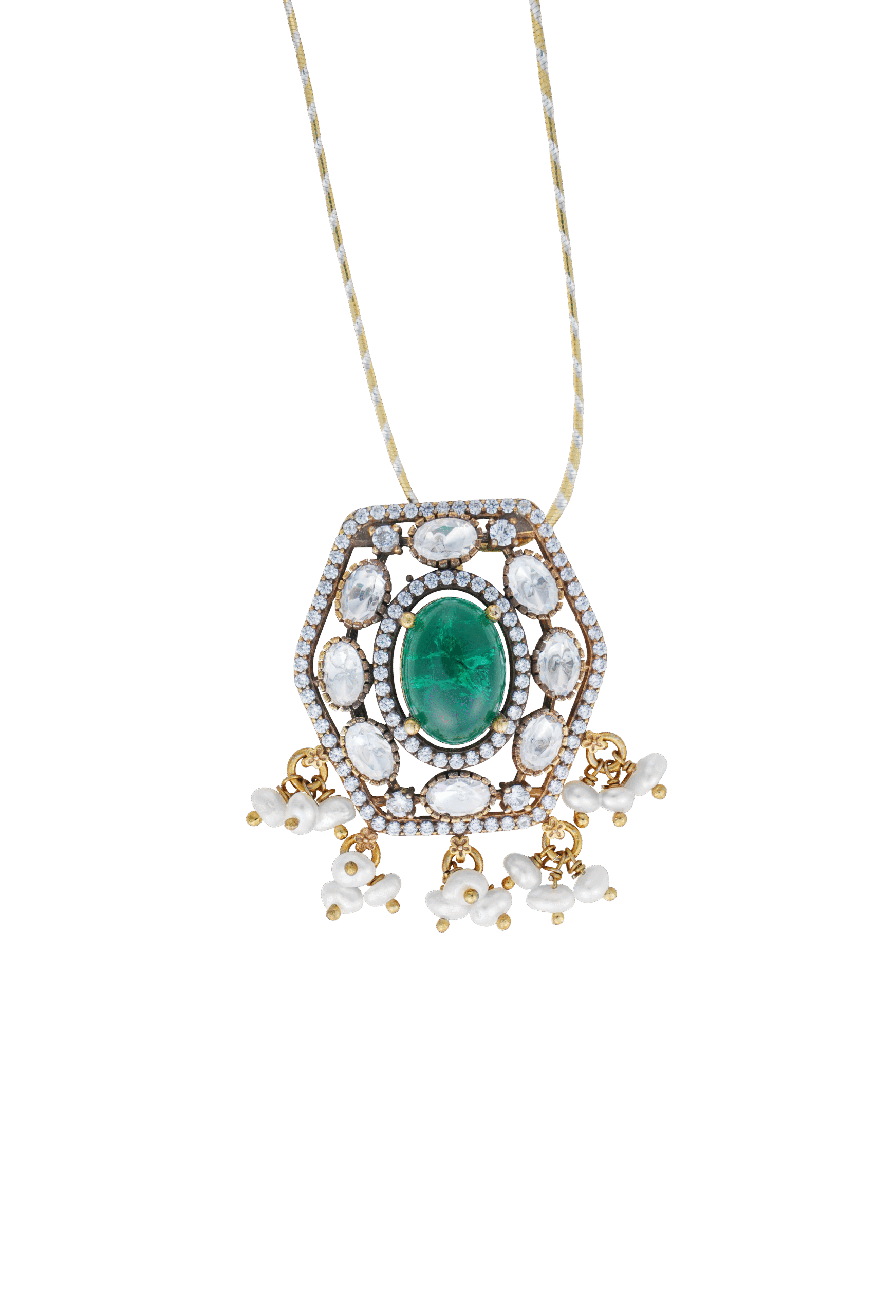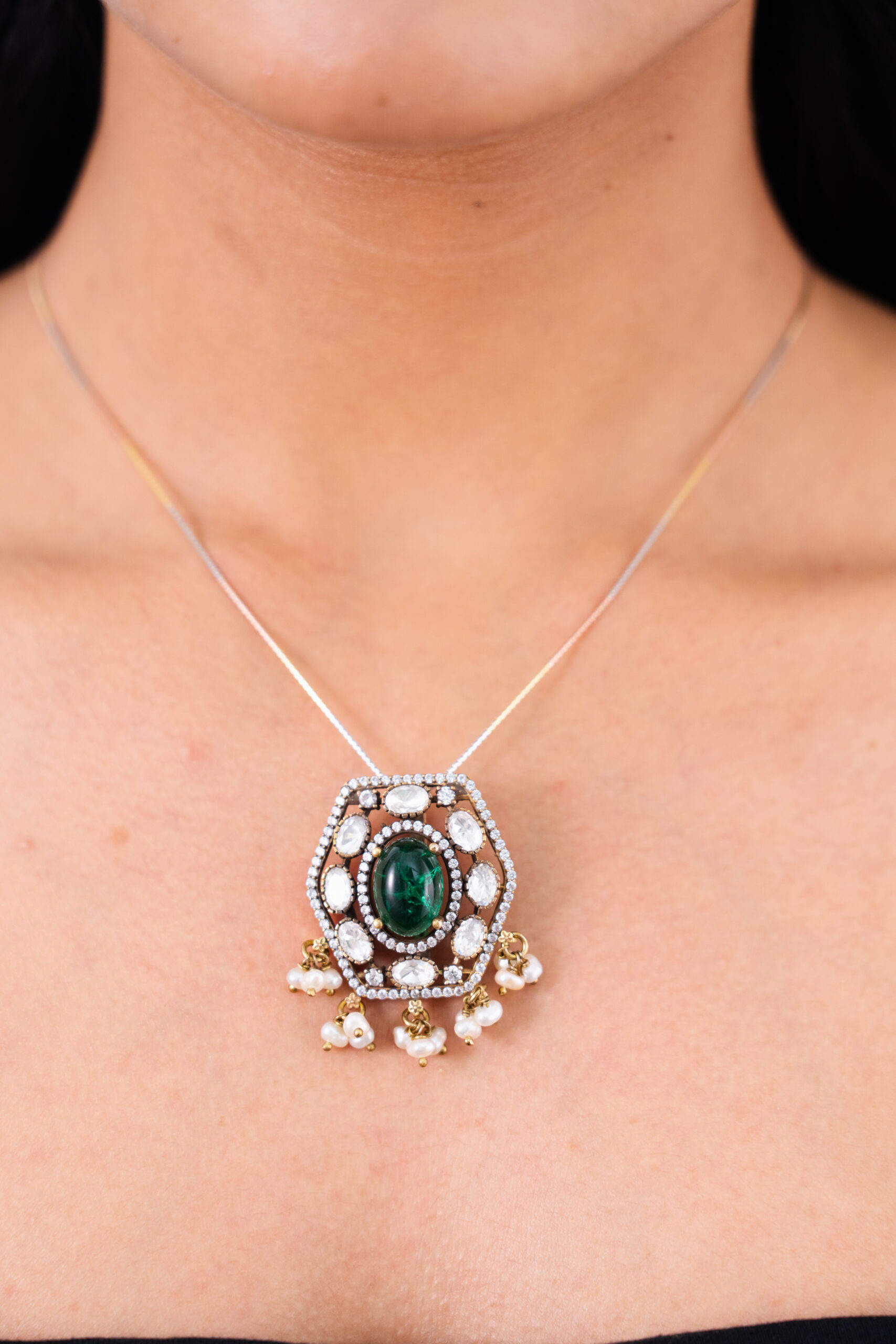 This necklace features a striking hexagonal pendant with a vibrant emerald at its center, surrounded by luminous white stones and delicate pearl drops, creating a unique and contemporary design perfect for your every event