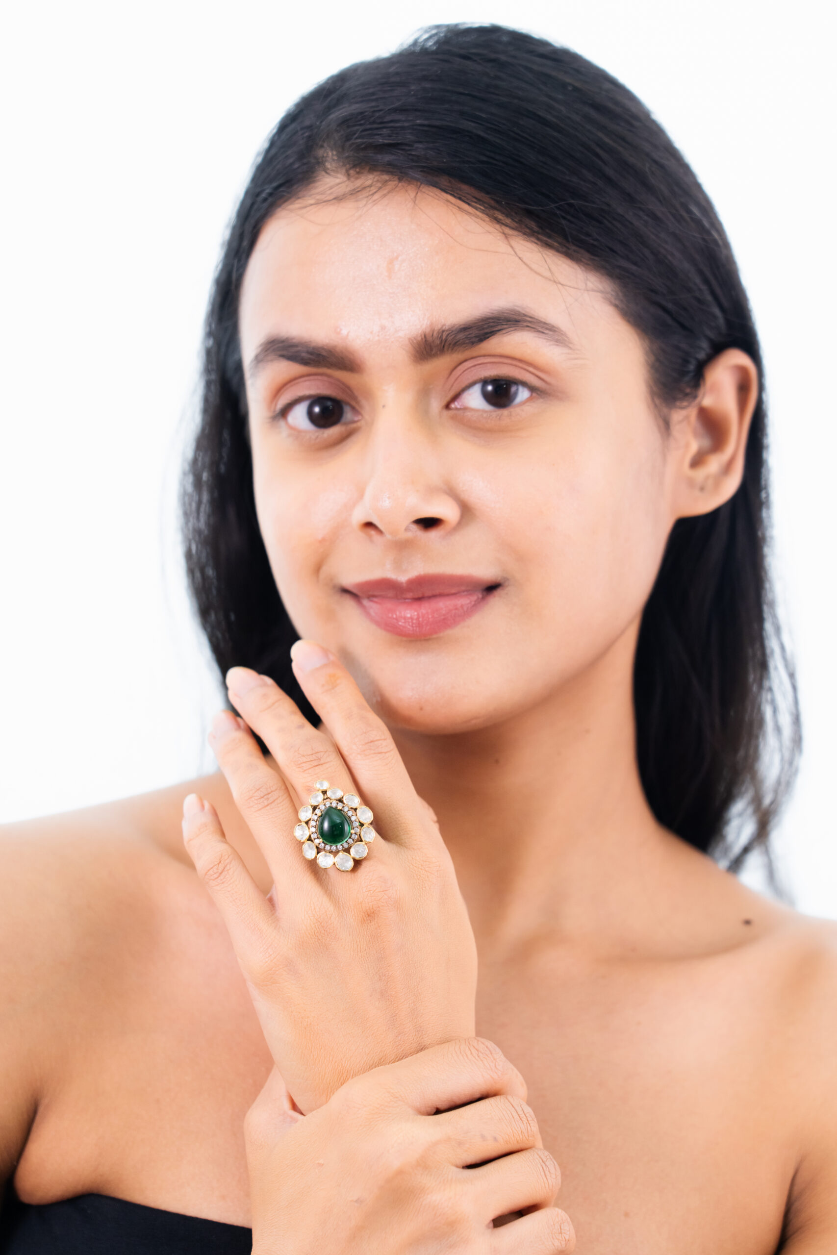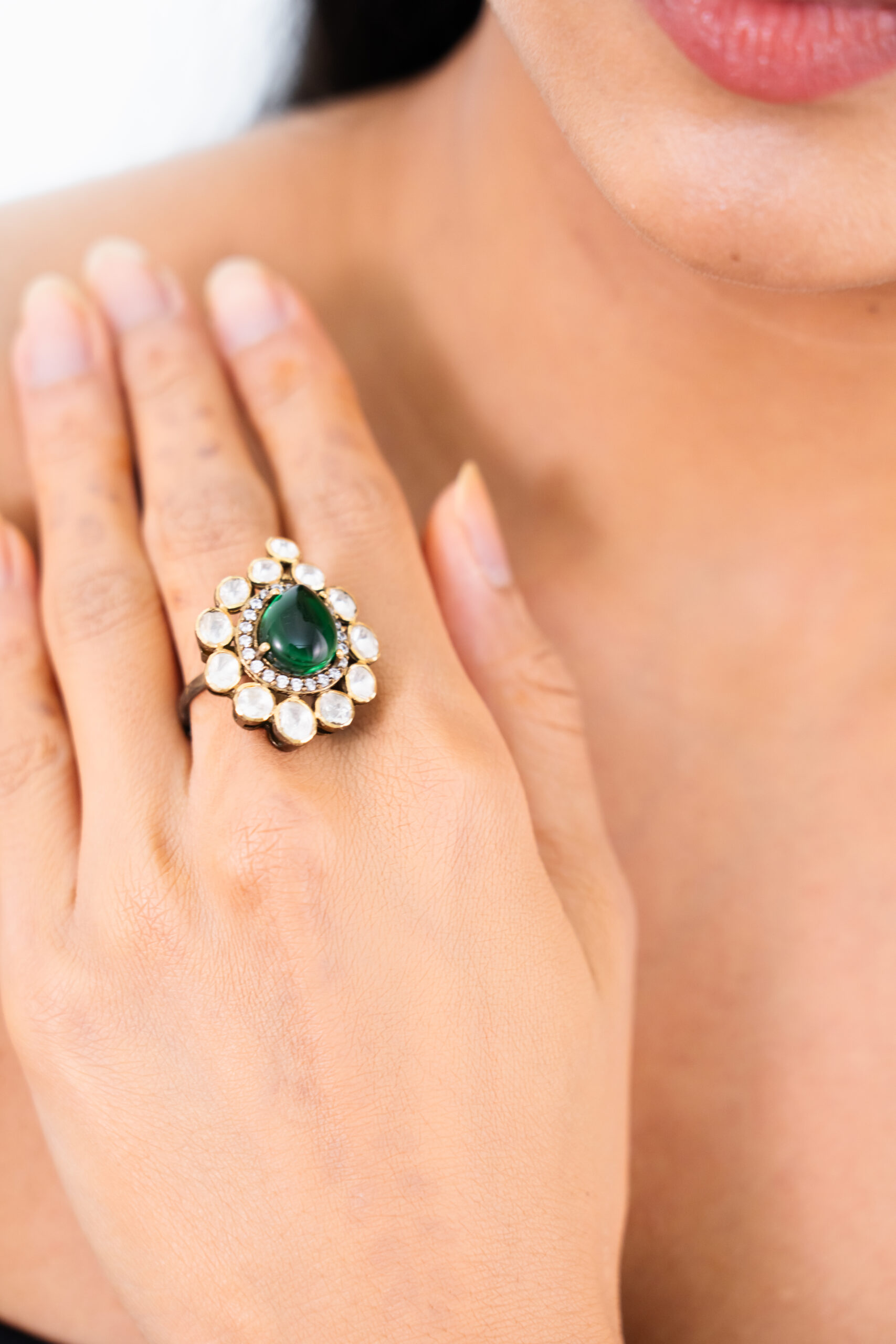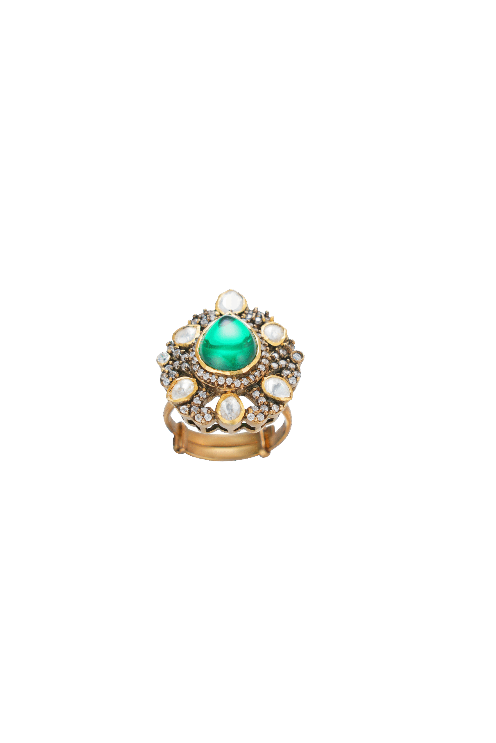 Deep, mesmerizing emerald at the heart, encircled by a starburst of luminescent stones in a textured gold-plated setting. This adjustable ring, crafted in 92.5 silver, echoes the grandeur of Indra’s court, a regal statement for discerning style.