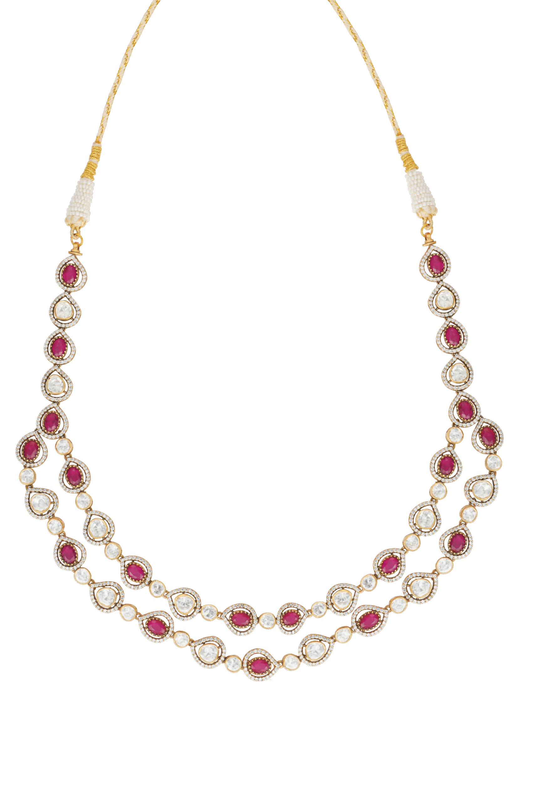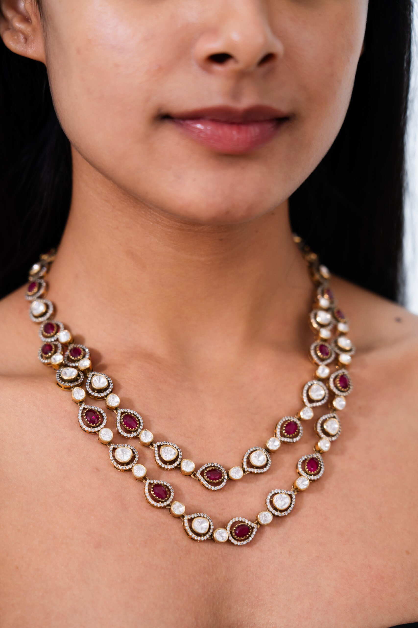 This necklace features two delicate strands, each showcasing vibrant rubies and luminous mozonite, accented with pearls and Swarovski crystals, creating a layered elegance