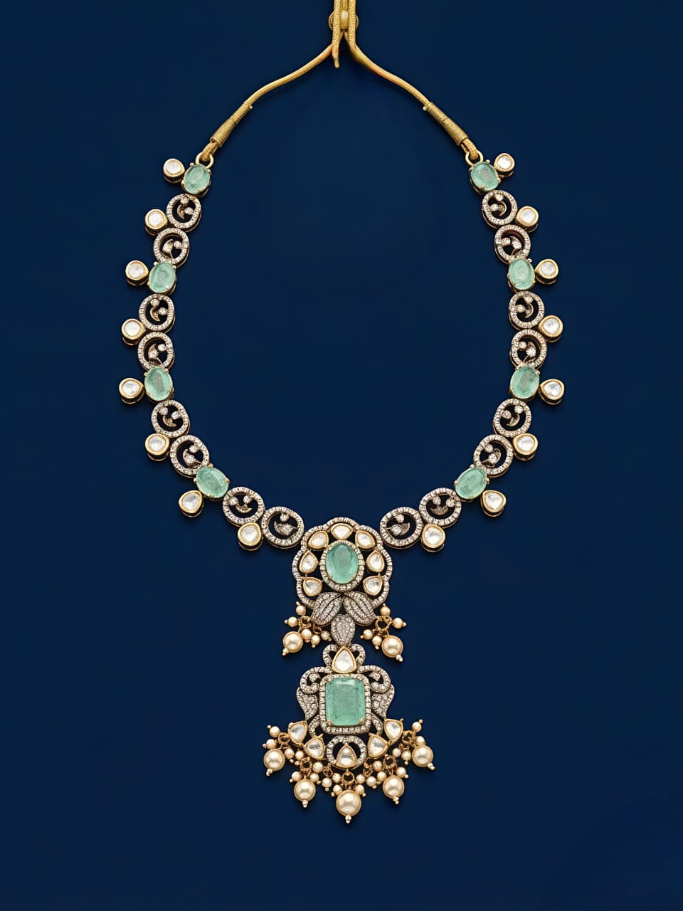 An exquisite silver necklace beautifully studded with shimmering moissanite and CZ, featuring soft mint-green stones and delicate pearl drops. The intricate circular motifs and statement pendant create a luxurious, regal look—perfect for weddings, festive celebrations, and elegant evening wear.