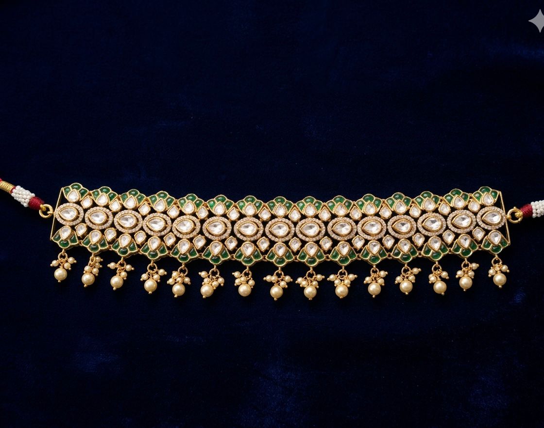 A stunning silver choker intricately studded with sparkling moissanite and CZ stones, accented with vibrant green stones and delicate pearl drops. This elegant piece blends traditional craftsmanship with modern sparkle, making it perfect for weddings, festive occasions, and statement styling.