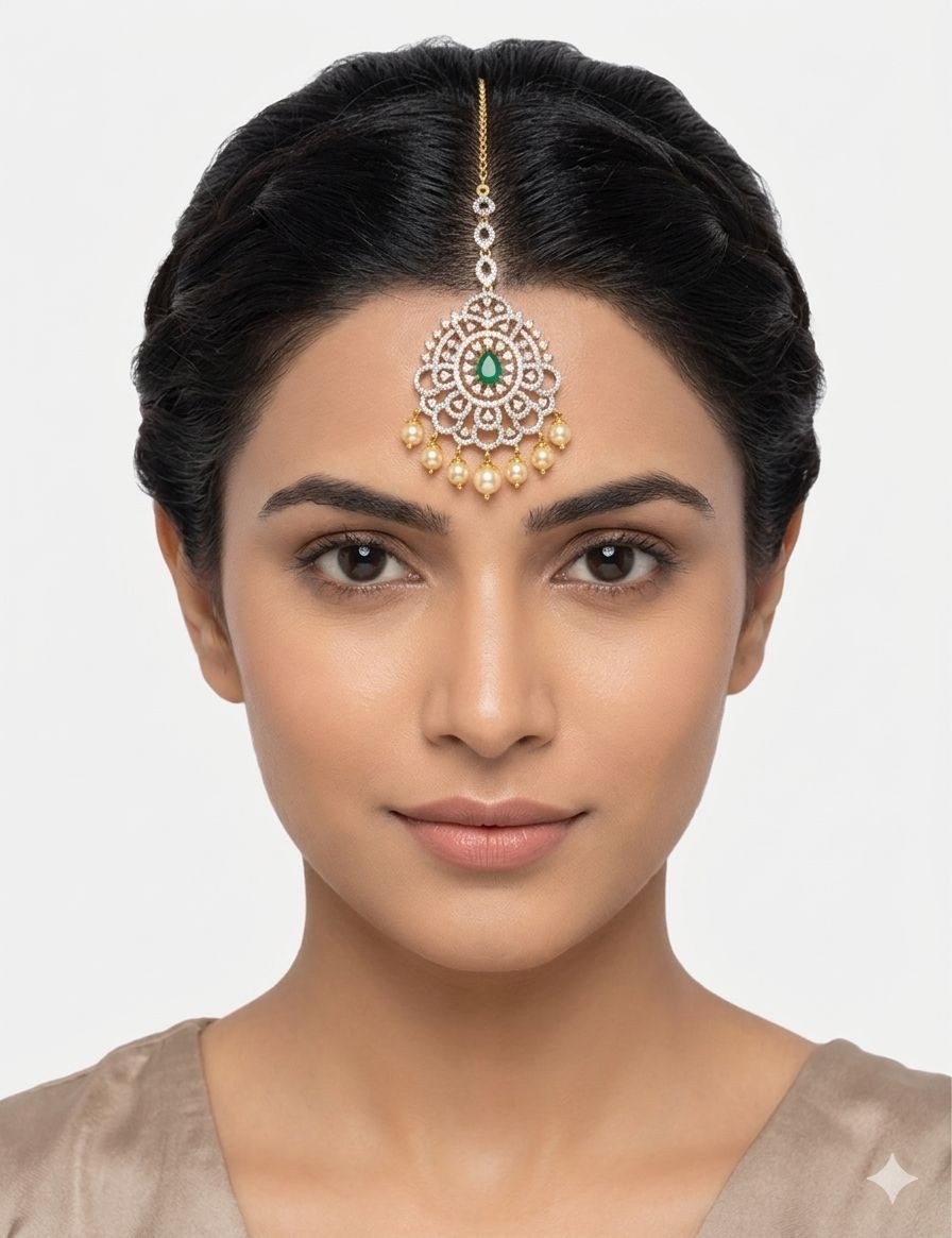 Graceful silver maang tikka featuring a green centre stone, adorned with sparkling moissanite and CZ, finished with elegant pearl drops—perfect for bridal elegance.