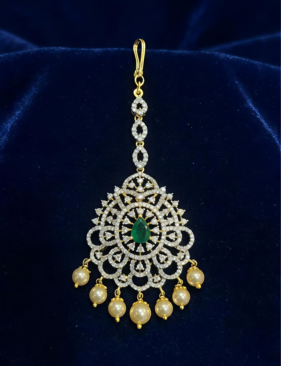 Moissanite & Green Stone Silver Maang Tikka with Pearl Drops