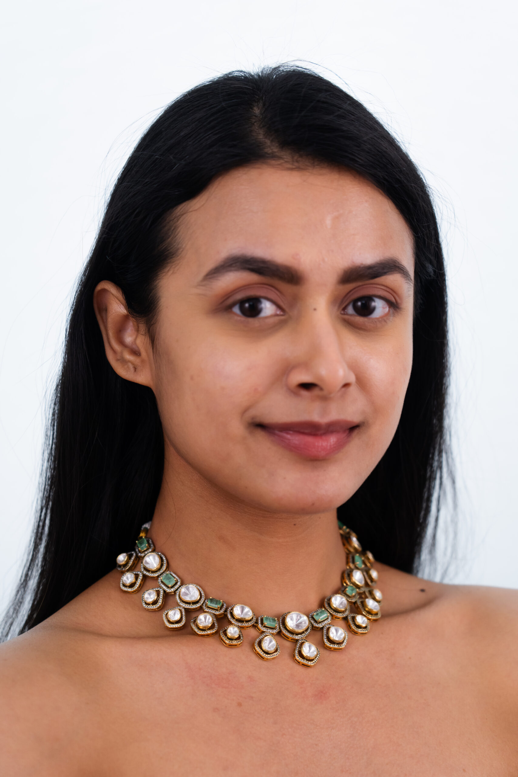 A breathtaking fusion of mozonite brilliance and soft green emerald accents, this handcrafted polki necklace exudes old-world charm. Framed with shimmering Swarovski details, it’s a perfect blend of heritage and sophistication.