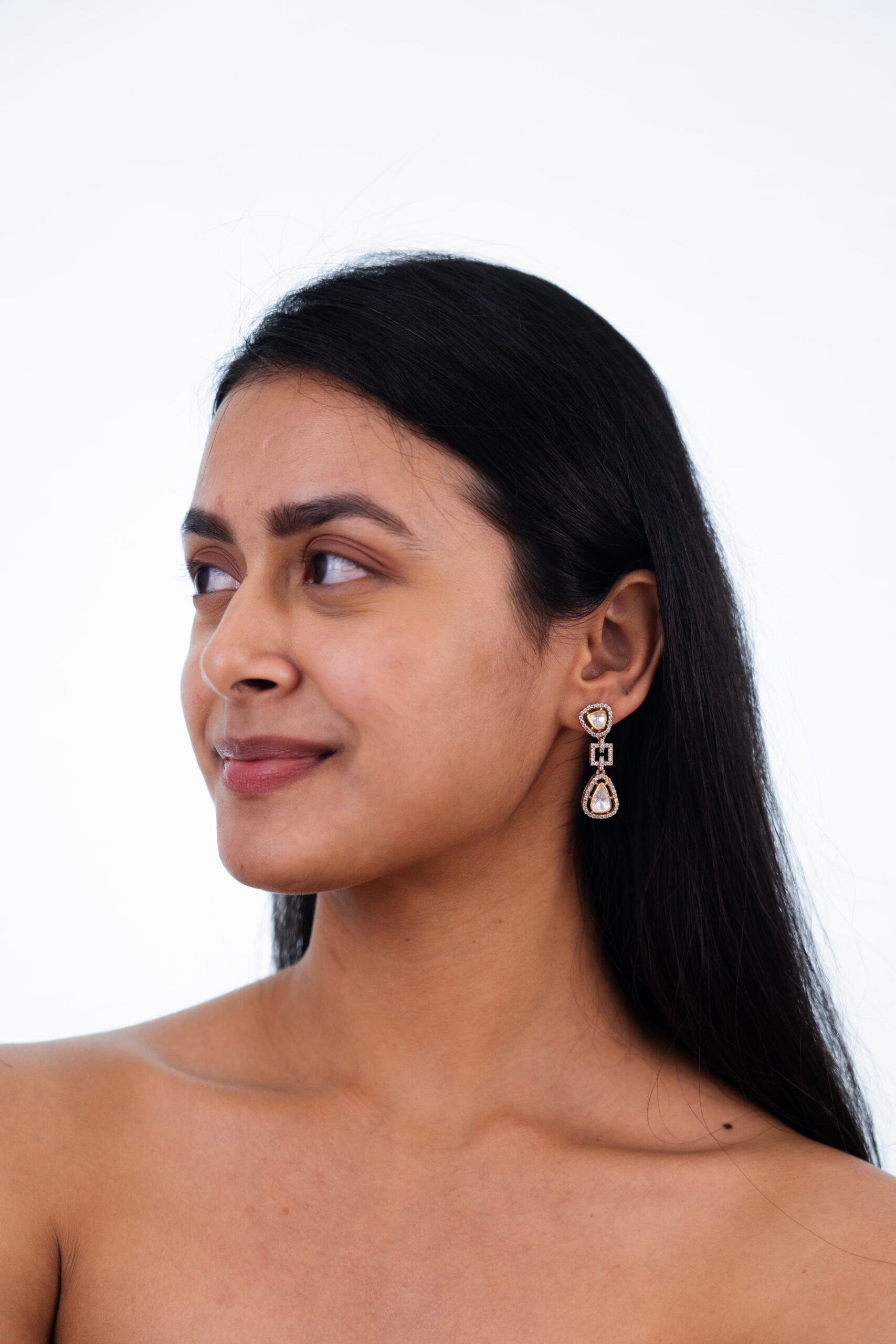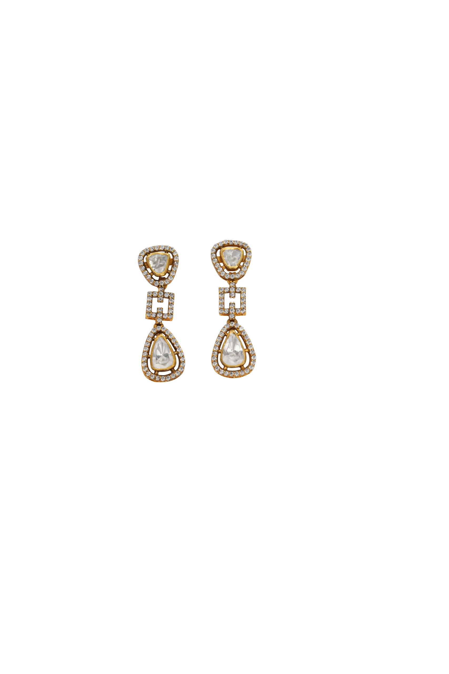 Modern drop earrings featuring two brilliant, uniquely shaped mozonite stones connected by a stylish geometric link, all outlined with delicate sparkling Swarovski crystals. A contemporary statement for your style.