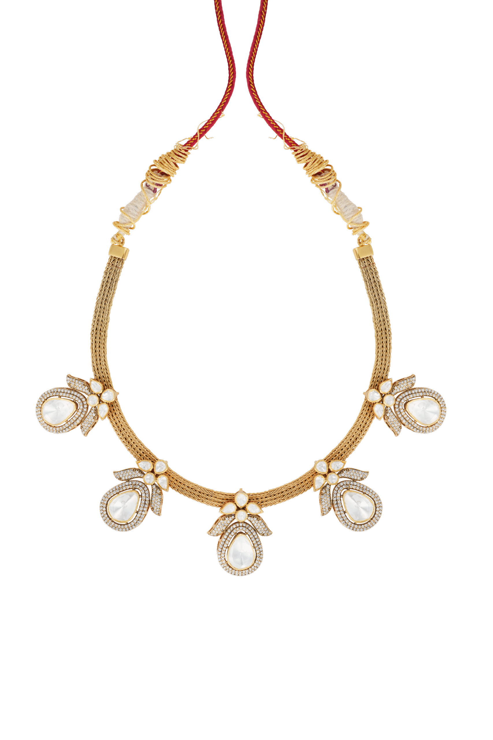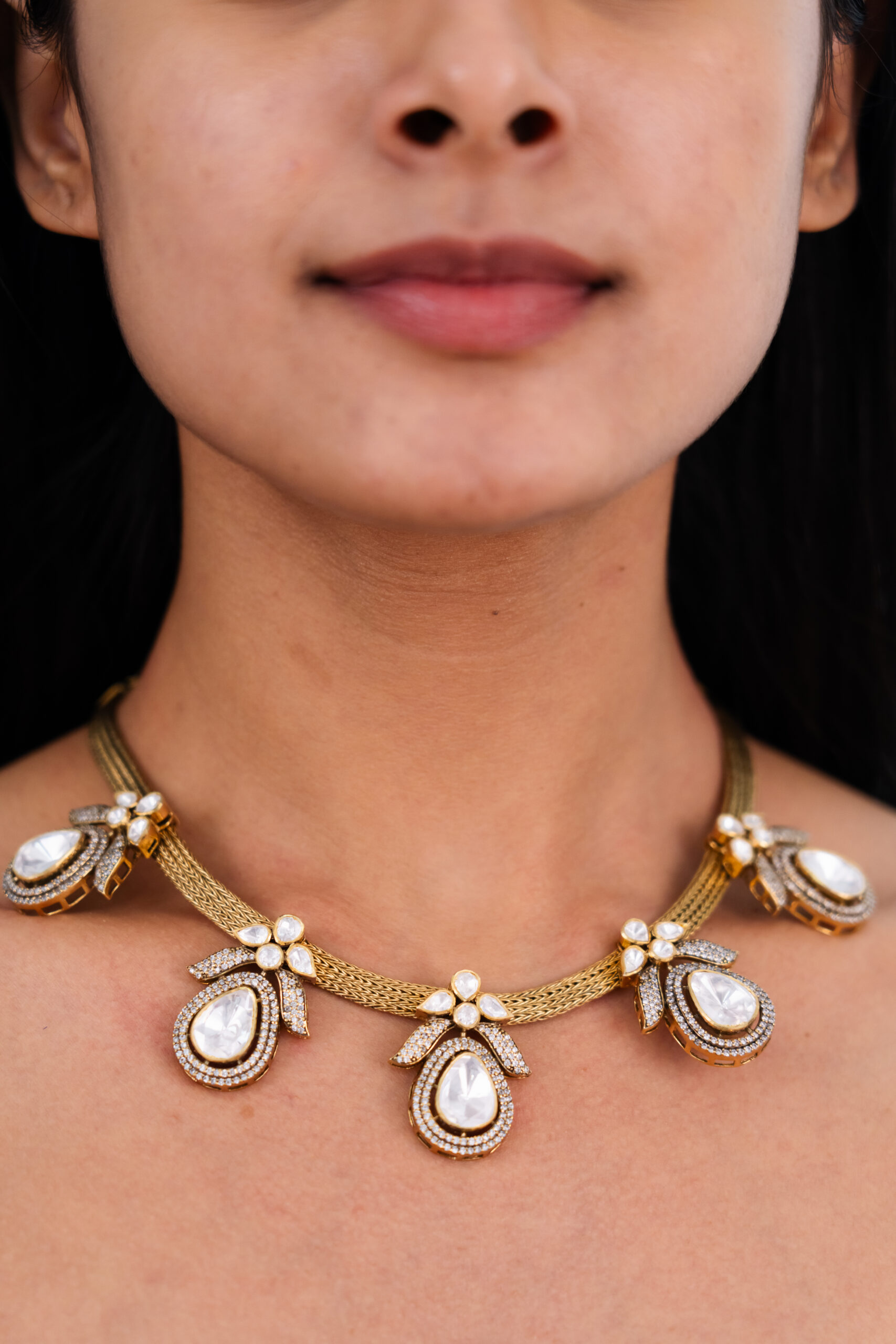 A repeating pattern of pear-shaped mozonite pendants, framed by delicate Swarovski crystals, adorns a striking textured chain, creating a statement choker ideal for adding a contemporary edge to your special occasions